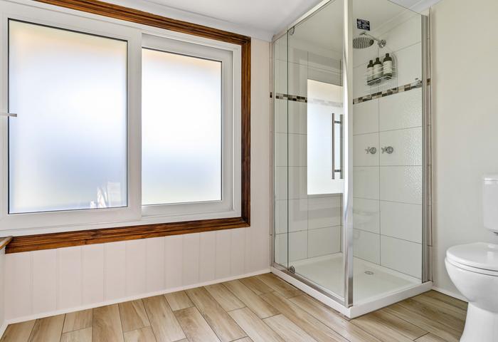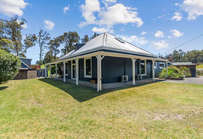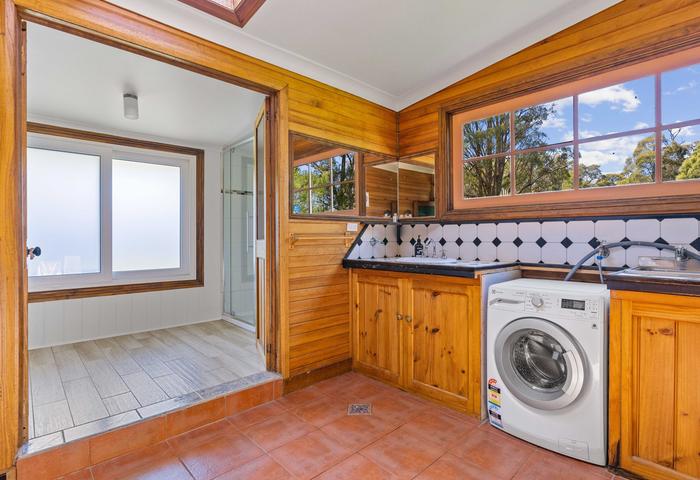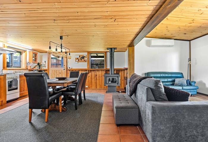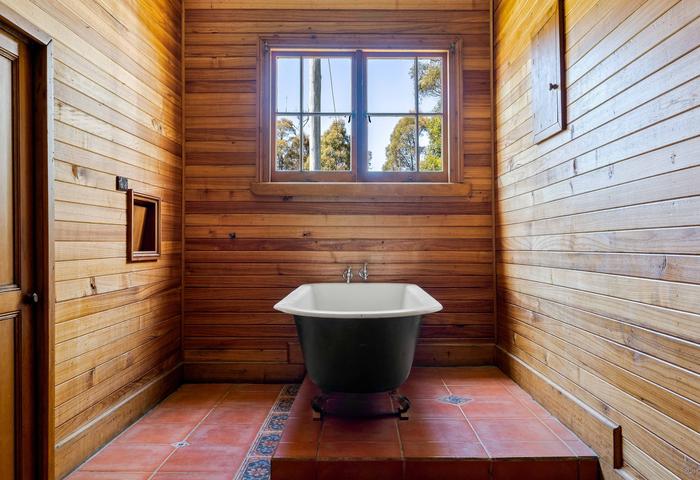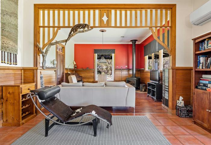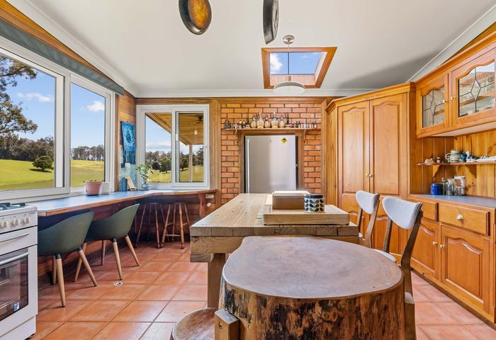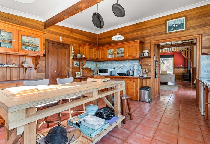 Spacious living and dining areas make the most of the landscape, while the country-style kitchen blends rustic charm with modern functionality. A timber-lined bathroom with clawfoot tub, separate shower room, and large laundry complete the home’s comfortable layout.