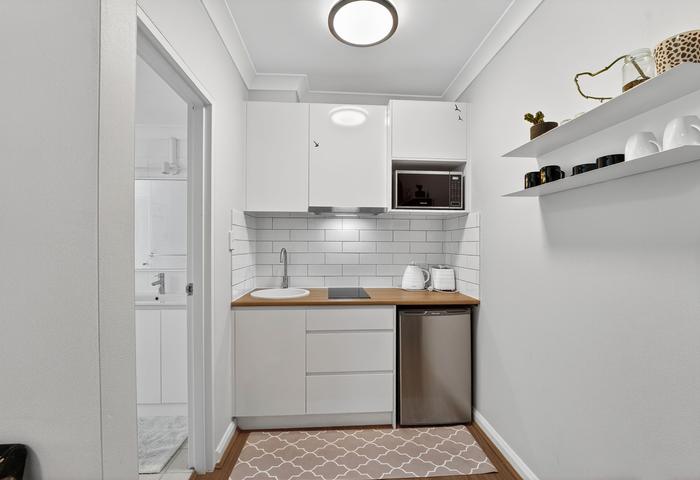 - Dual kitchens: Fully equipped kitchenette and kitchen with electric cooktop, microwave, mini fridge/ fridge, kettle, toaster, cookware, utensils. Dishwasher and oven in main kitchen only.