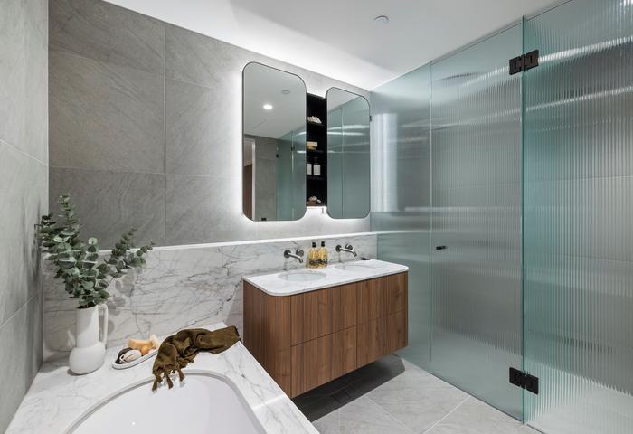 The custom-designed gourmet kitchen with scullery is the epitome of style and functionality, with walnut cabinetry, natural stone benchtops, high-end Miele appliances and integrated Liebherr fridge/freezer, creating a flawless culinary space. The primary suite is a sanctuary of indulgence, boasting floor-to-ceiling corner windows, a designer walk-in robe, and a marble-clad ensuite with a double stone vanity, walk-in shower, and integrated bath and private terrace. Equally impressive second Master Bedroom features a WIR, ensuite and private terrace, while the third bedroom offers built-in robes, serviced by a luxurious central bathroom/powder room. With thoughtful additions such as a full-size laundry, abundant storage, ducted heating and cooling, secure parking for two cars, EV charging and storage cage, this residence effortlessly balances style with practicality. Situated just 100 meters from Albert Park Lake and moments from Melbourne’s best cafes, restaurants, and transport links, this is an address that redefines urban elegance and convenience.