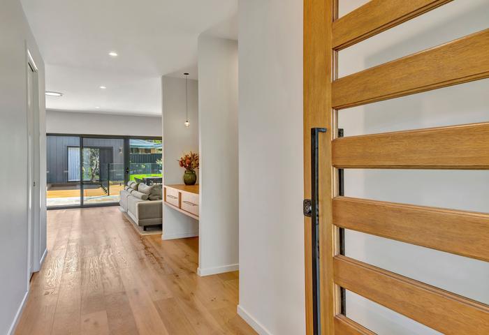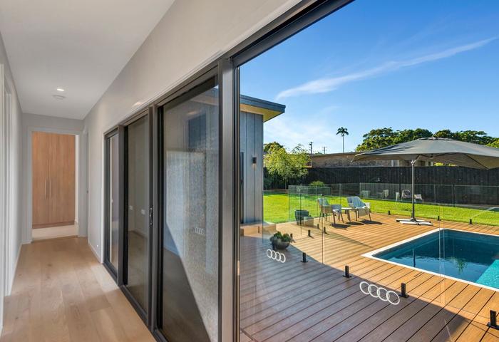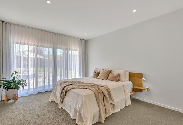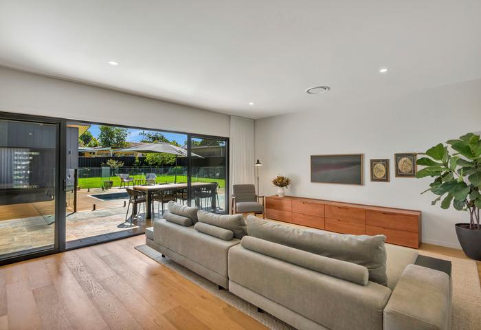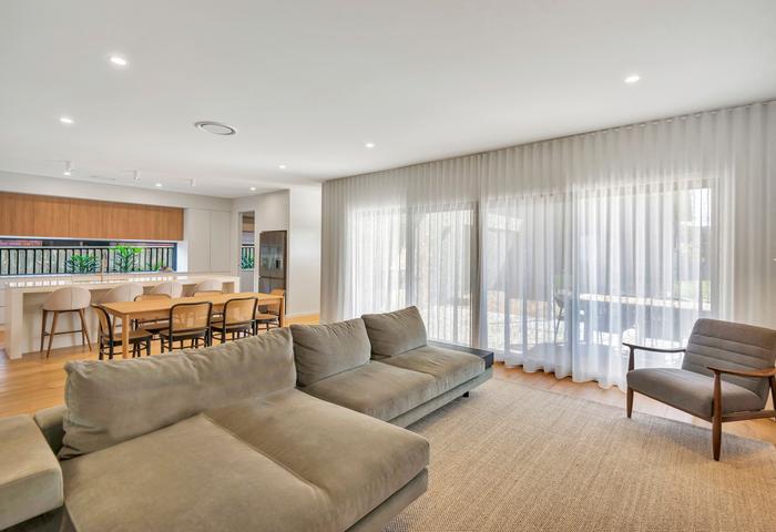 Positioned on a spacious 890m2 parcel with premium Buffalo lawns, the home unfolds across a beautifully considered single level. With high ceilings throughout and views to the pool from living areas and bedrooms thanks to large glass sliding doors, natural light pours through the interior. Natural oak flooring and pure wool carpets bring warmth and texture, complemented by premium fittings and a cohesive palette of high-end finishes throughout.