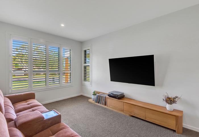 At its heart, the designer kitchen is both a showpiece and hub for entertaining – featuring induction cooktops and a walk-in butler’s pantry with a second dishwasher and generous storage. The adjoining living and dining zones flow effortlessly to the alfresco entertaining area, complete with marble paved surrounds and sparkling pool with Ekodecking.