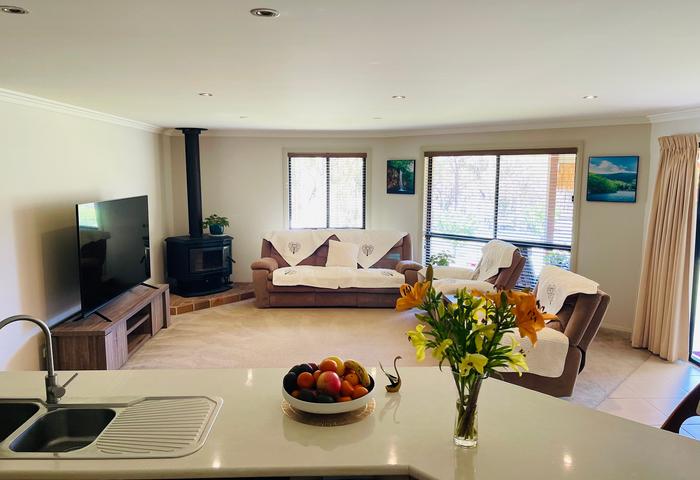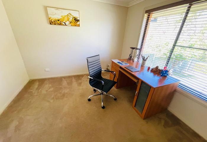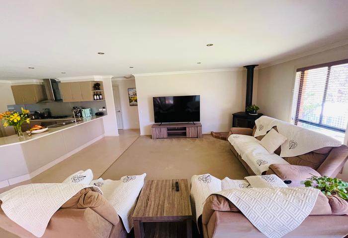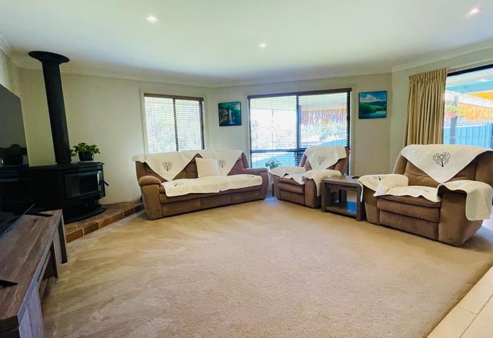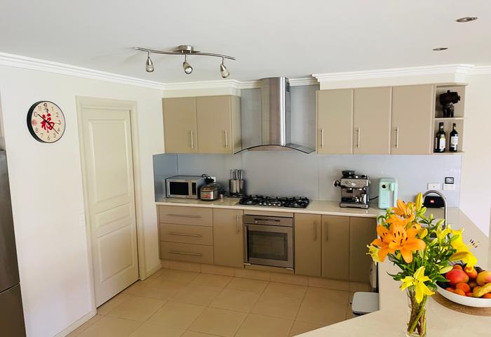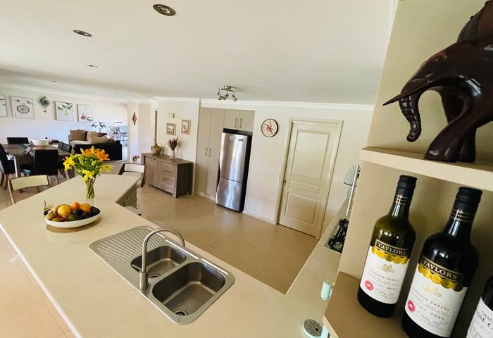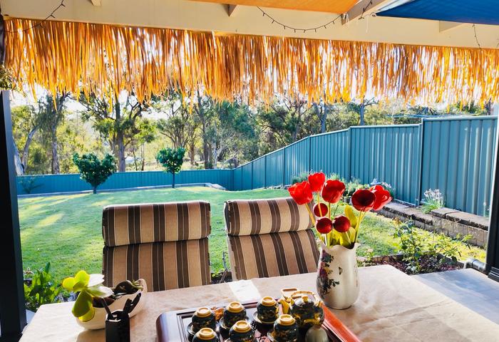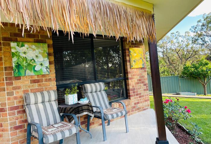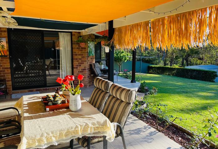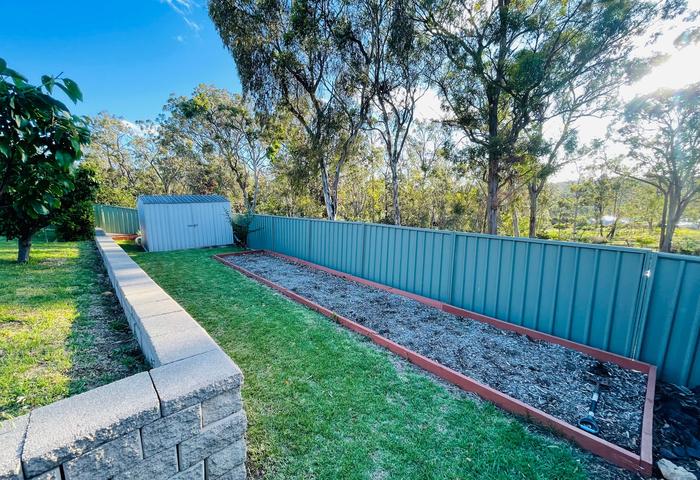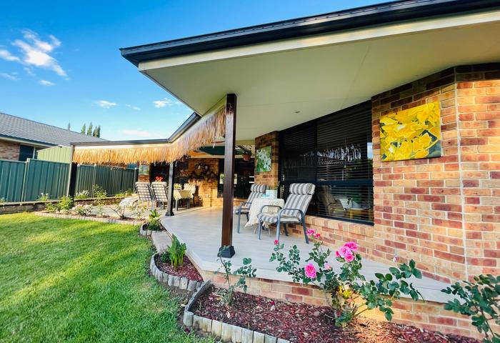 The outdoor areas are equally impressive. The front yard includes a flat lawn and a charming rose garden framed by manicured hedges beneath the master bedroom windows. The covered, tiled patio with Fiji-style synthetic thatch fringe at the rear features stylish sunshades, creating an effortless holiday-at-home atmosphere. Enjoy your morning coffee while watching kangaroos wander from time to time quietly through the tree-lined reserve beyond — a daily reminder that life here moves just a little slower. The gently sloping backyard includes retaining walls, well-kept hedges, three vegetable beds, seven fruit trees (three cherry, two Japanese plum, two apricot), and a garden shed with ample space for tools — a sanctuary for those who love to grow, create, and unwind.