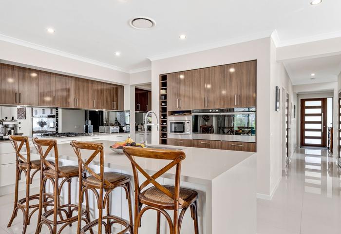 Designed for modern family living, the ground floor of the main home features high ceilings and a flowing open-plan layout connecting the kitchen, dining, family and outdoor areas. The stunning kitchen includes a large island bench, quality appliances, and a full butler’s pantry with a second sink — perfect for entertainers or busy households. Also included downstairs are a study or optional fifth bedroom, a well-equipped laundry, powder room, and a generous double garage with workshop area plus understairs storage.