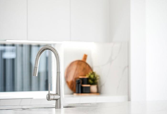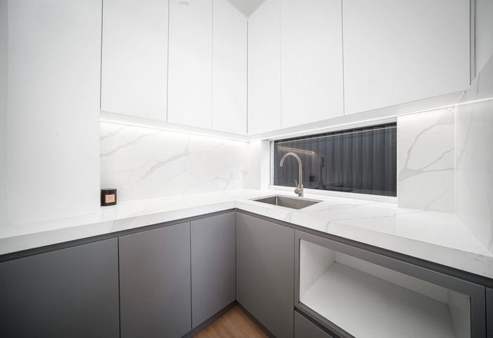 • Overhead built-in cupboards to the laundry with Calcutta stone benchtop