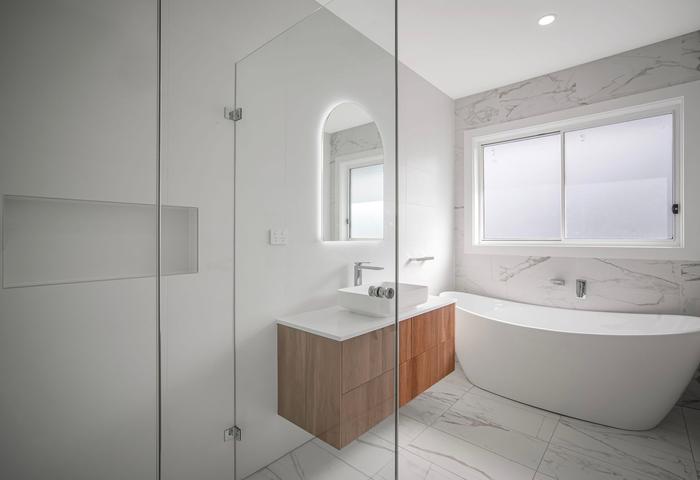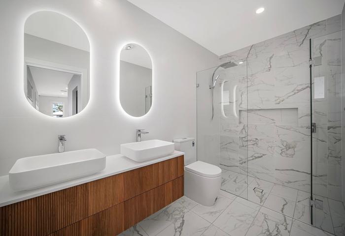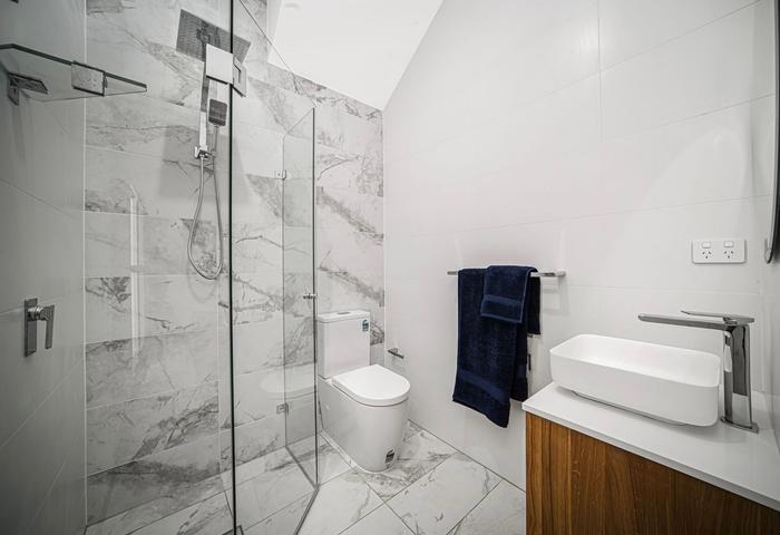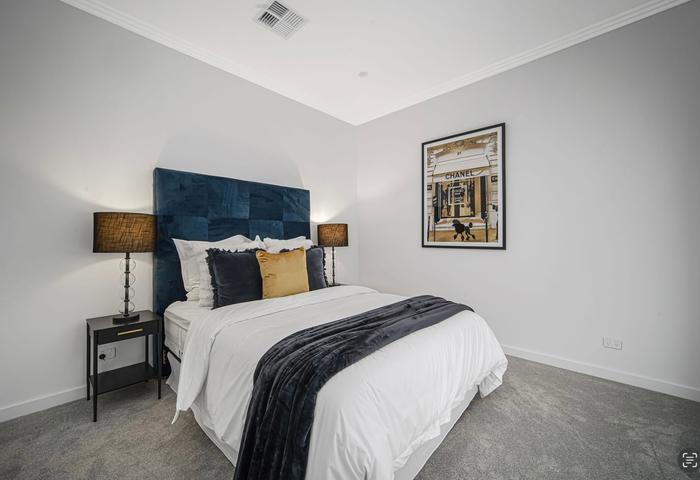 The home offers six spacious bedrooms, each with built-in robes, including a ground-floor guest suite — perfect for visitors, grandparents, or a home office. The master bedroom is a true sanctuary, boasting a huge walk-in wardrobe and a private ensuite complete with luxe wall-hung timber fluted vanities, 20mm stone tops, and a freestanding tub. The upstairs main bathroom mirrors this elegance, showcasing high-end floor-to-ceiling tiles and a freestanding bathtub for moments of retreat.