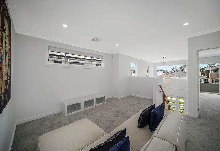 The impressive double-height entry void leads to multiple living zones, offering seamless flow between the family, living, and leisure rooms — creating the ideal setting for relaxation and entertaining alike.