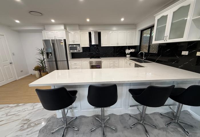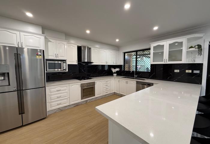 The home features three generous bedrooms, all fitted with mirrored built in wardrobes. The master bedroom includes an ensuite and private balcony, offering a peaceful retreat. A modern open plan kitchen forms the heart of the home, complete with gas cooking, dishwasher, breakfast bar and premium stone benchtops. The adjoining dining area creates a seamless setting for family meals and gatherings.
