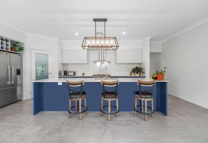 The gourmet kitchen is a culinary delight, featuring stone benchtops, a walk-in pantry, soft close cabinetry, Fisher Paykel appliances, including a French Door Fridge, 900mm wide freestanding oven, gas cooktop, microwave, dishwasher & ample bench space. Pendant lighting, a wine rack & thoughtful layout make this kitchen the true heart of the home.