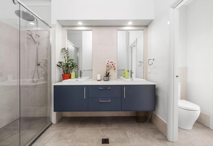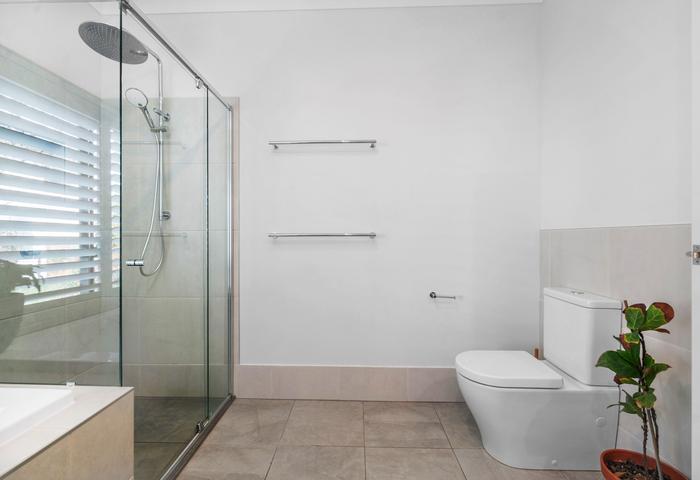 Modern Main Bathroom with stone benchtop & full-size bath.