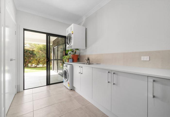 Large laundry with stone benchtops & Fisher Paykel washer & dryer & abundant storage.