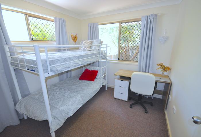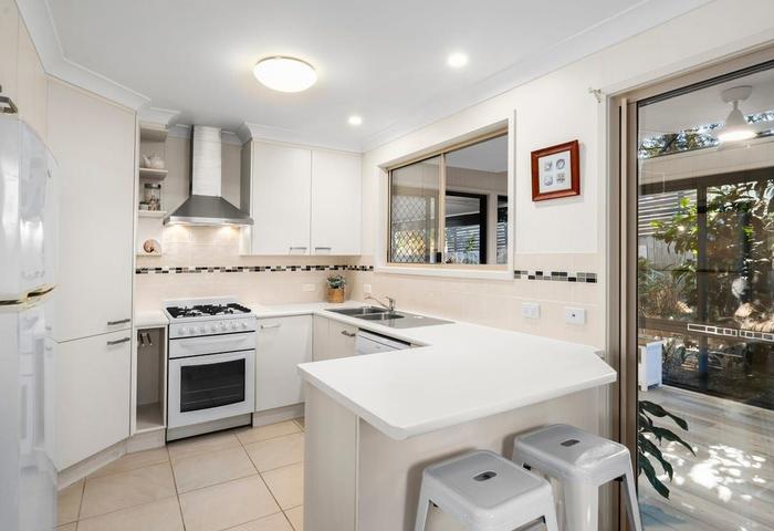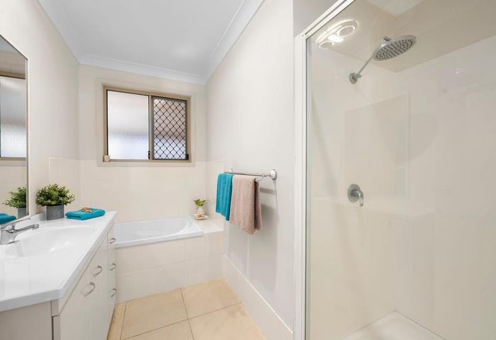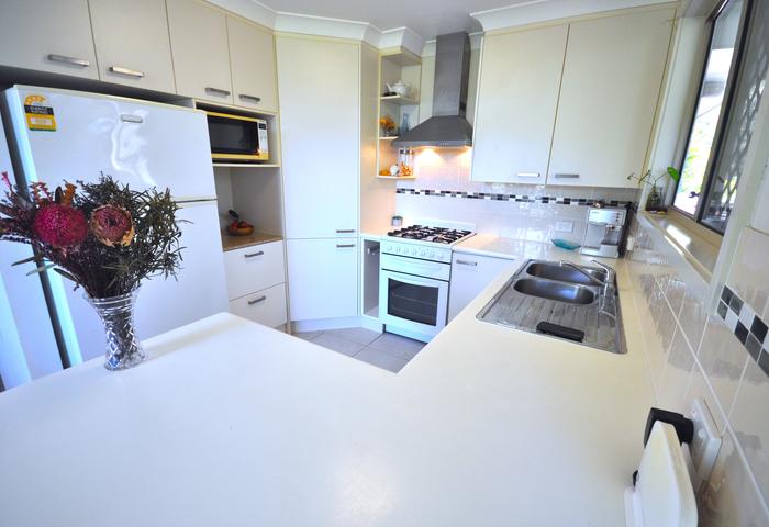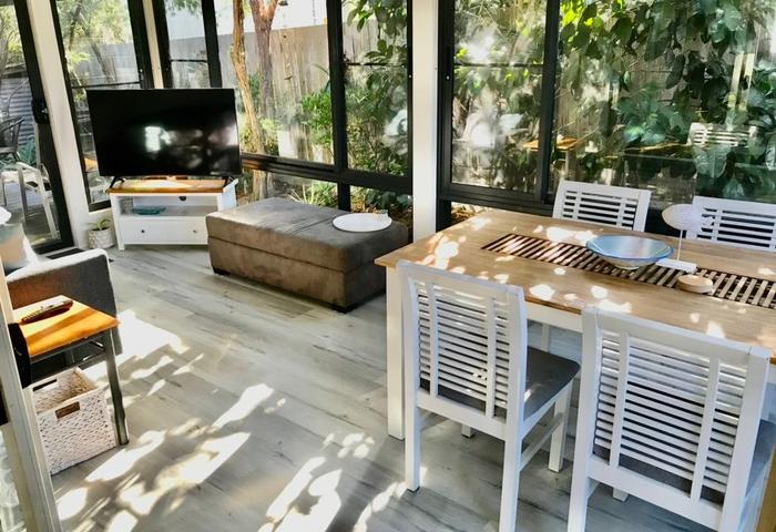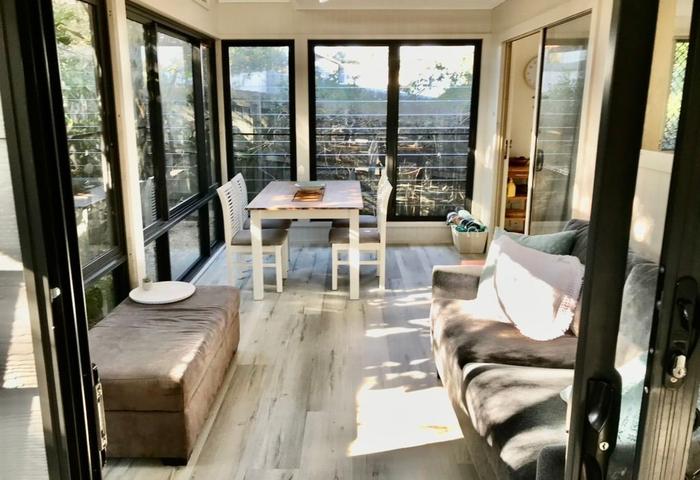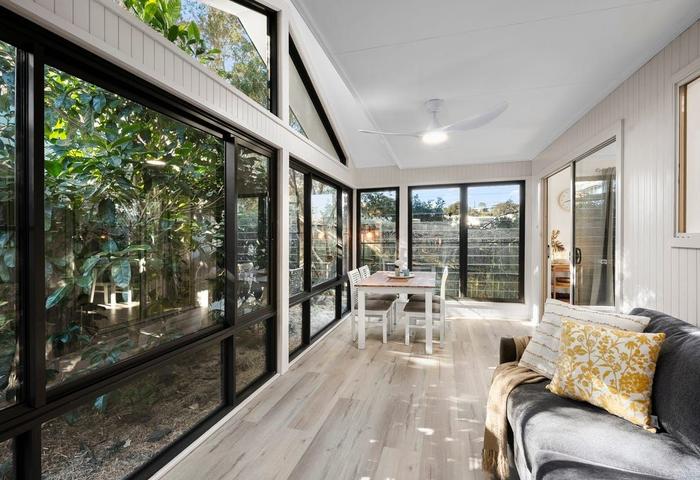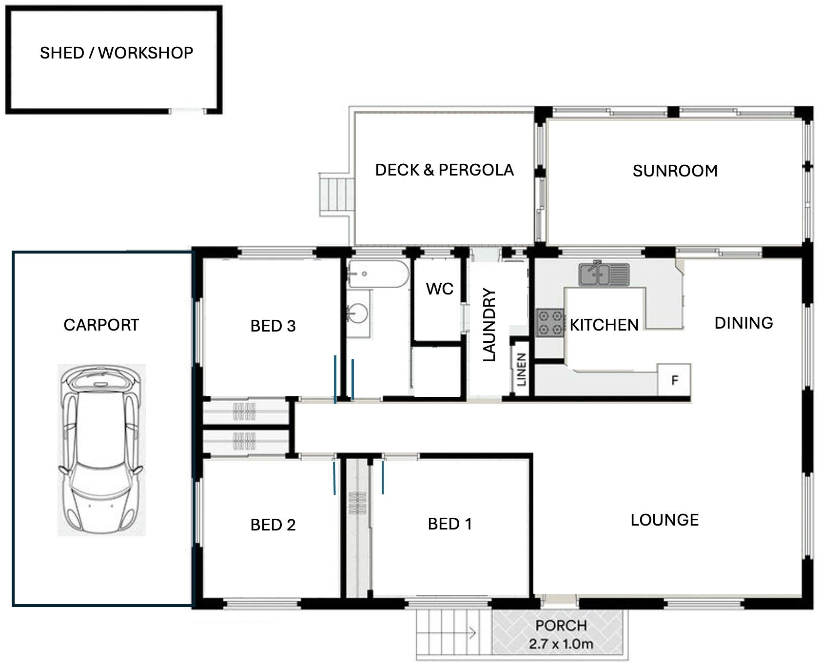 Inside, the functional kitchen features a neutral colour palette and a new Bosch dishwasher, while the open plan lounge and dining area creates a welcoming central living zone. A separate sunroom, filled with natural light, connects directly to the covered rear deck, enhancing the home’s indoor outdoor flow. The bathroom is neat and neutral, with a separate toilet for added convenience.