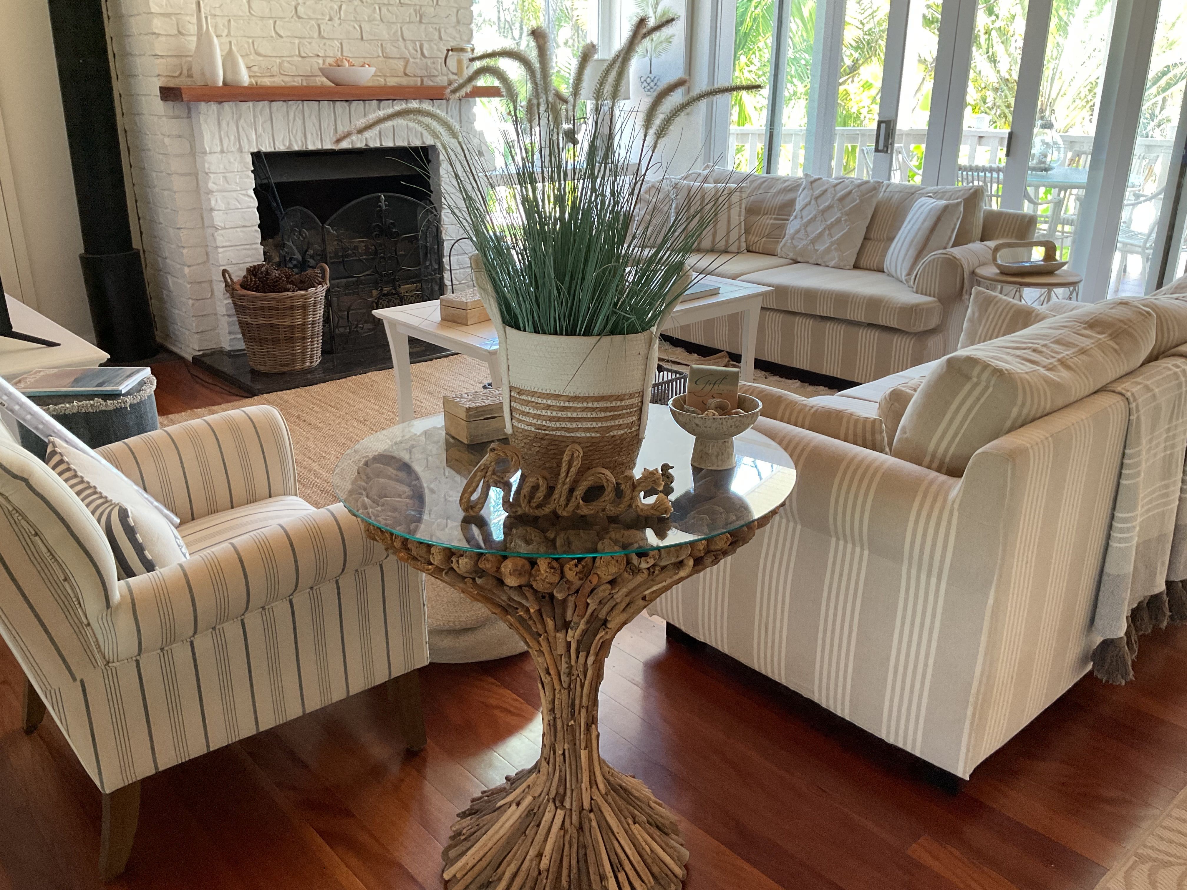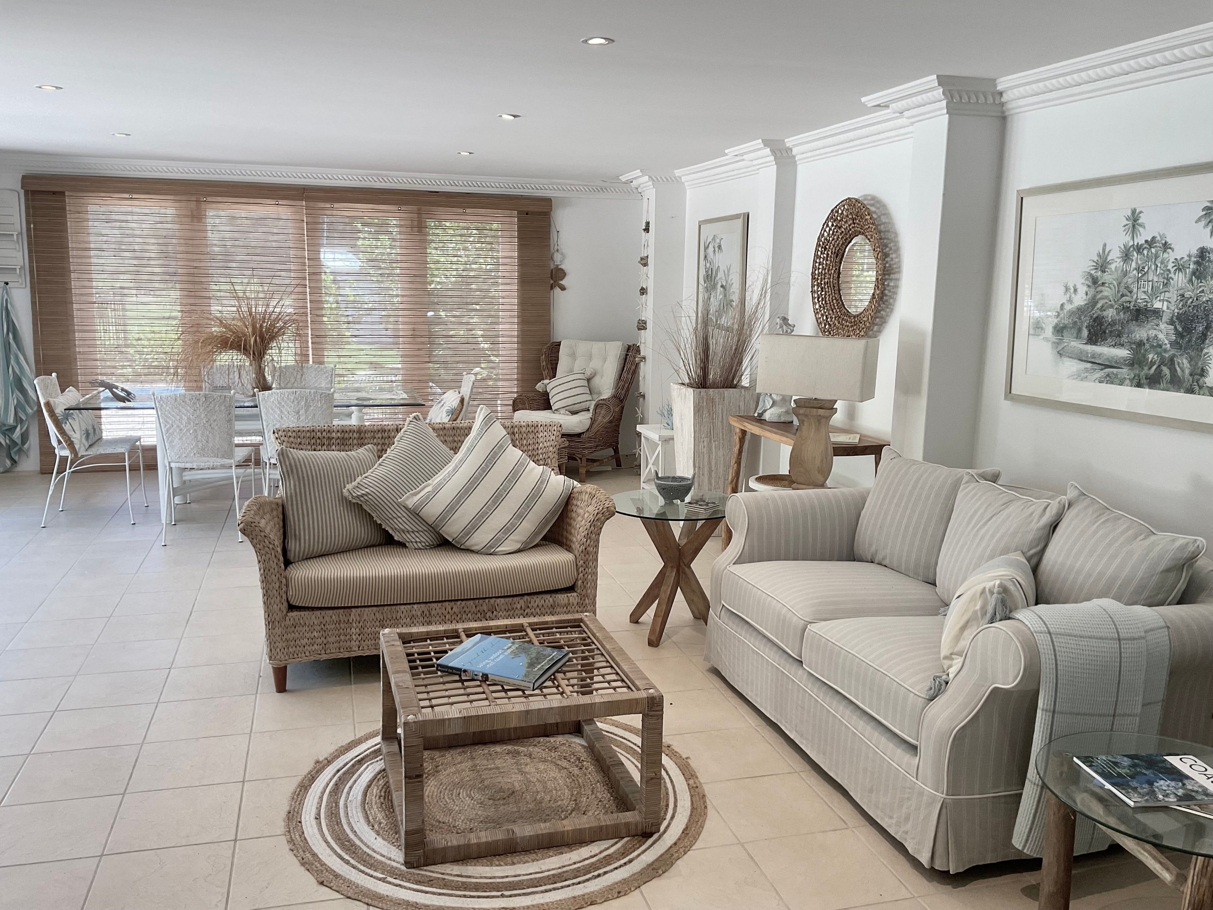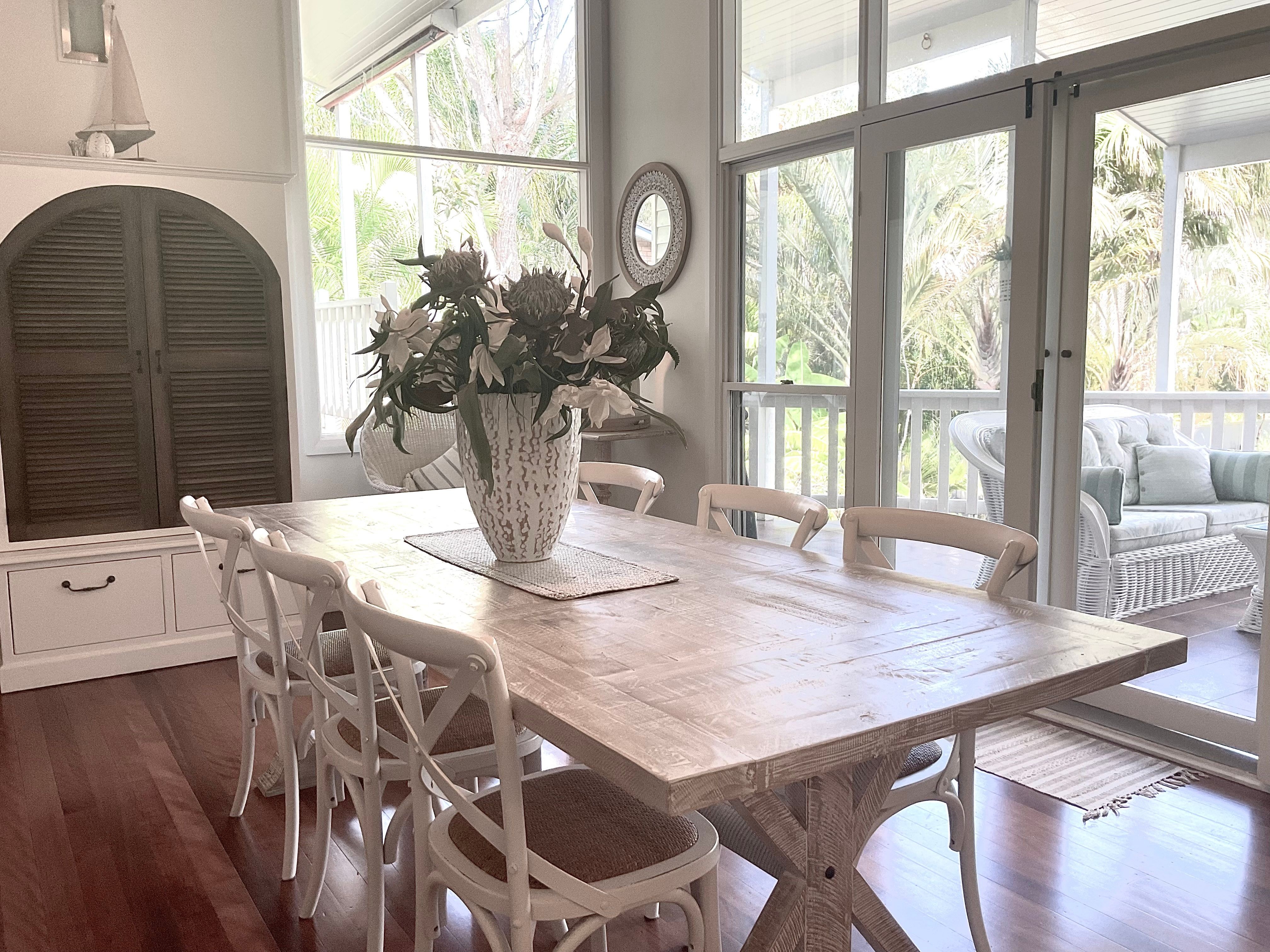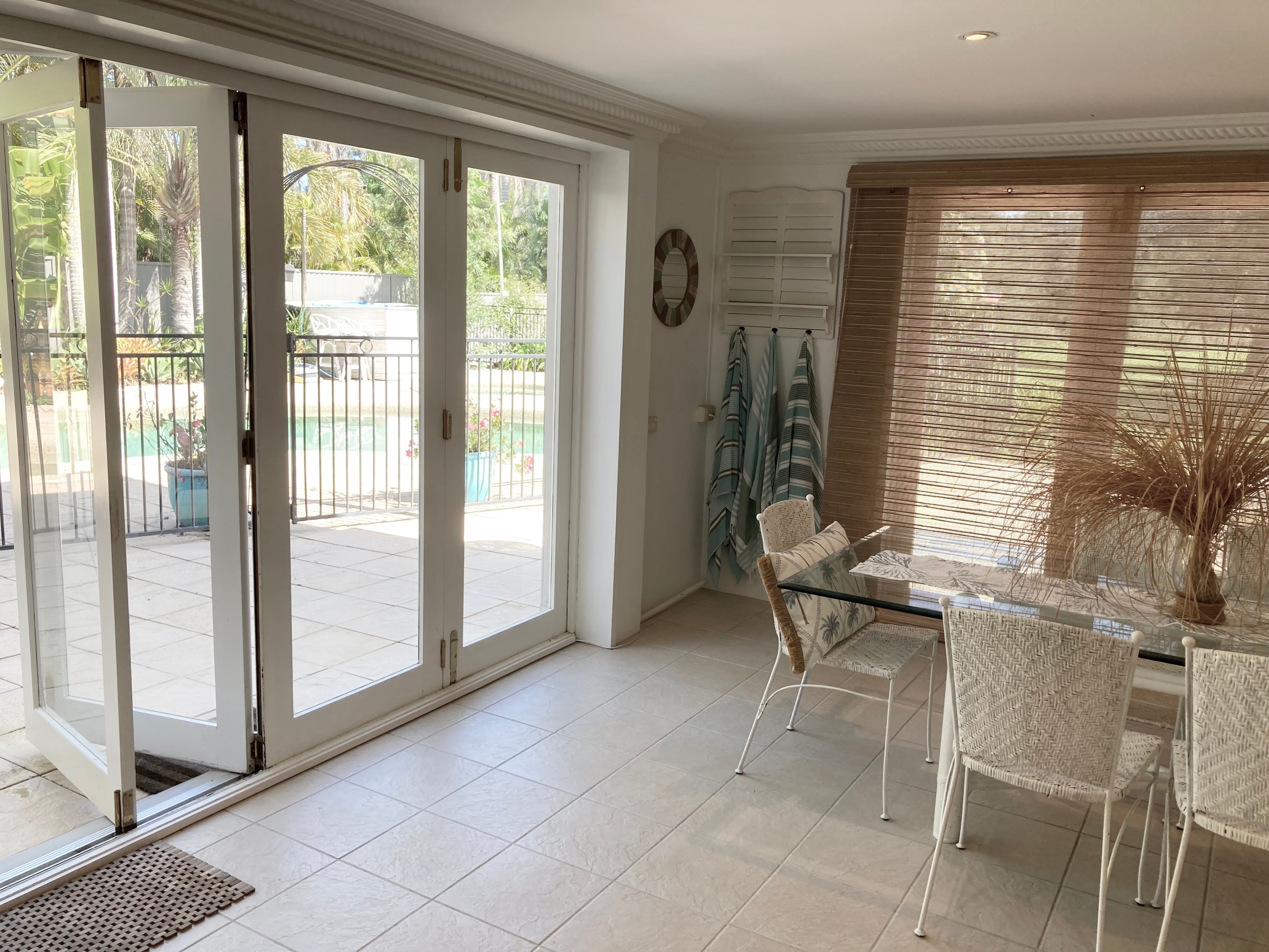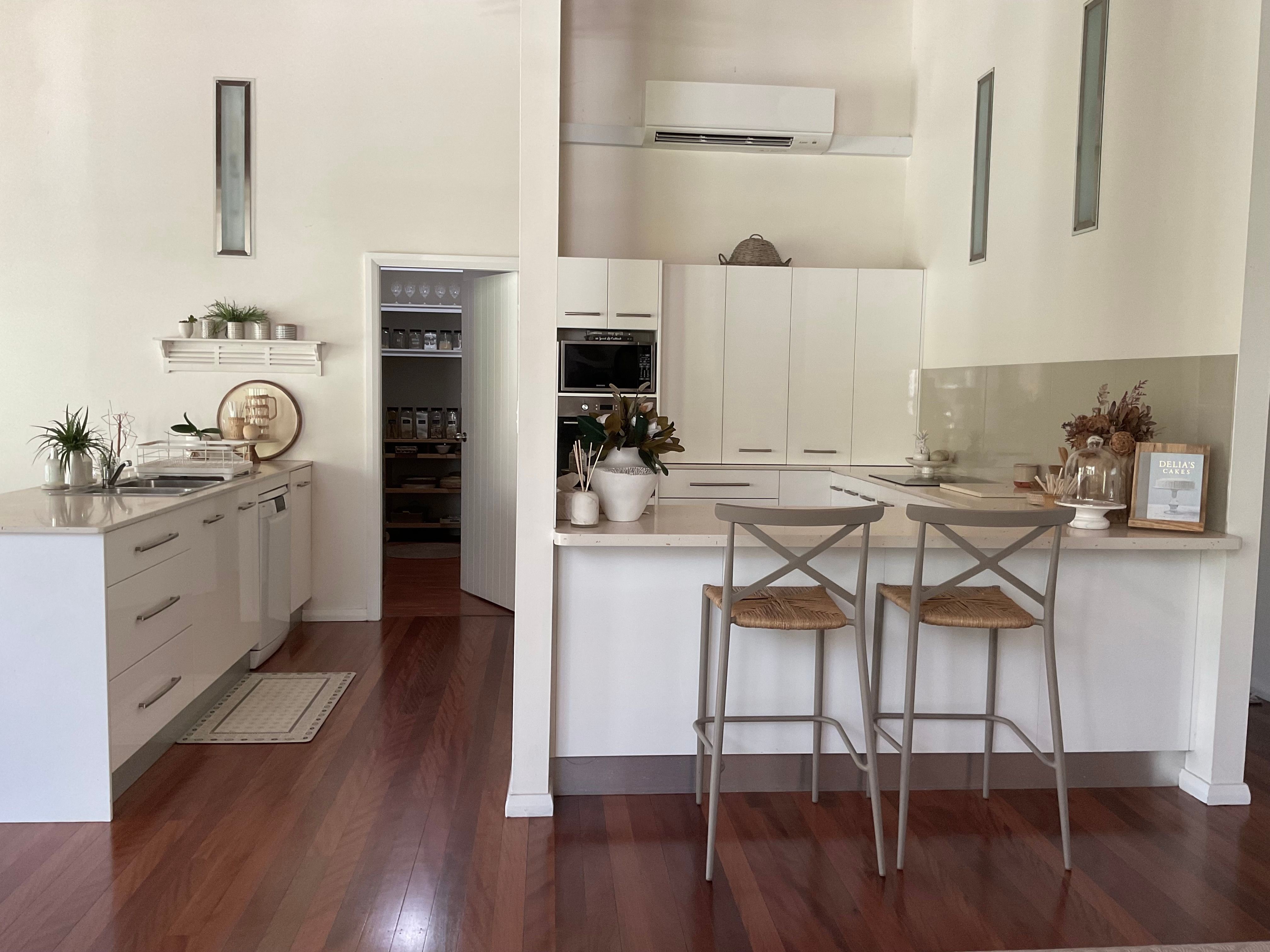 The large open plan kitchen under soaring ceilings includes a walk in pantry and is open to the lounge and dining areas …wonderful for entertaining . Surrounded by palm trees this area has a tropical and breezy holiday feel .