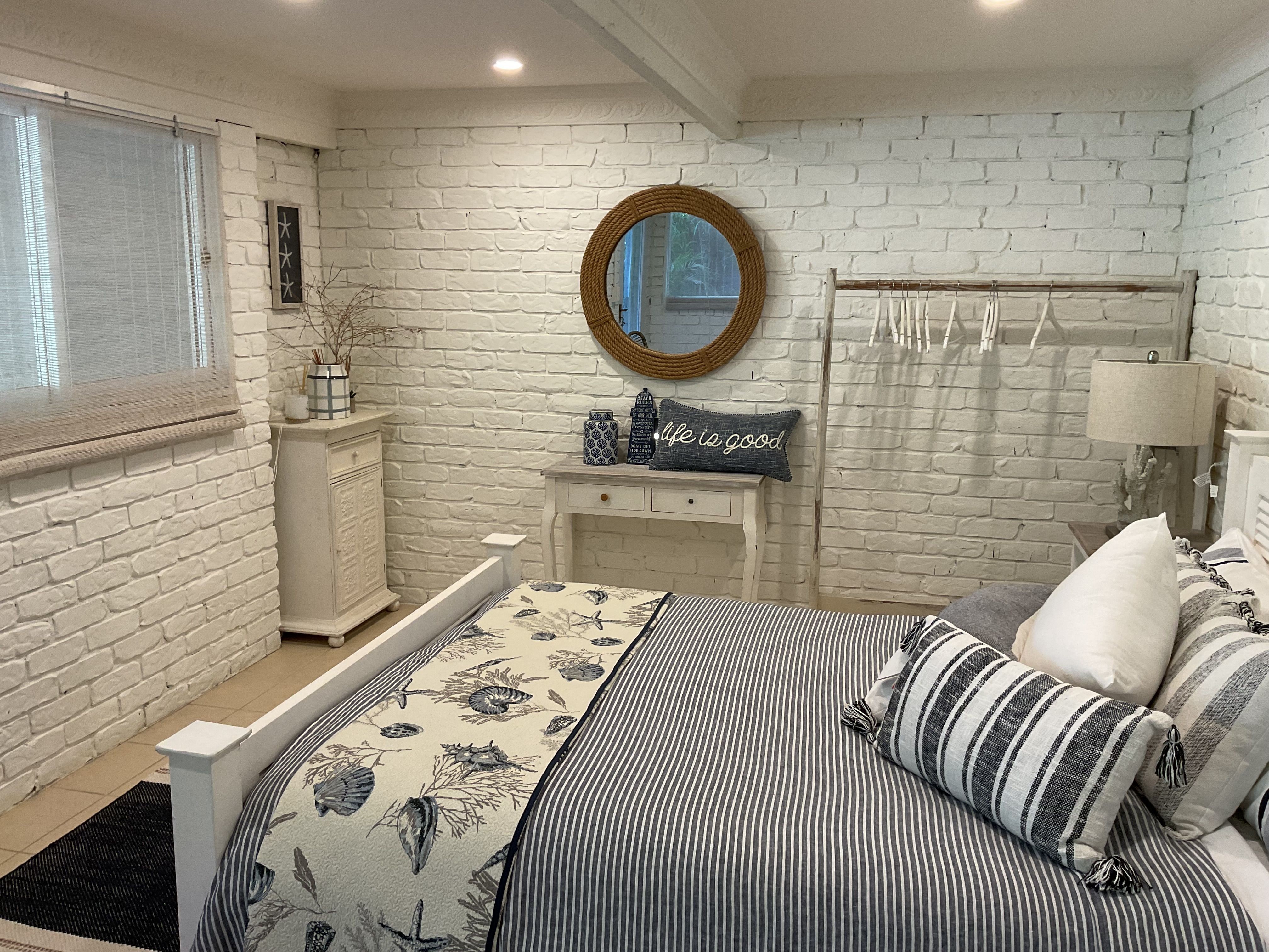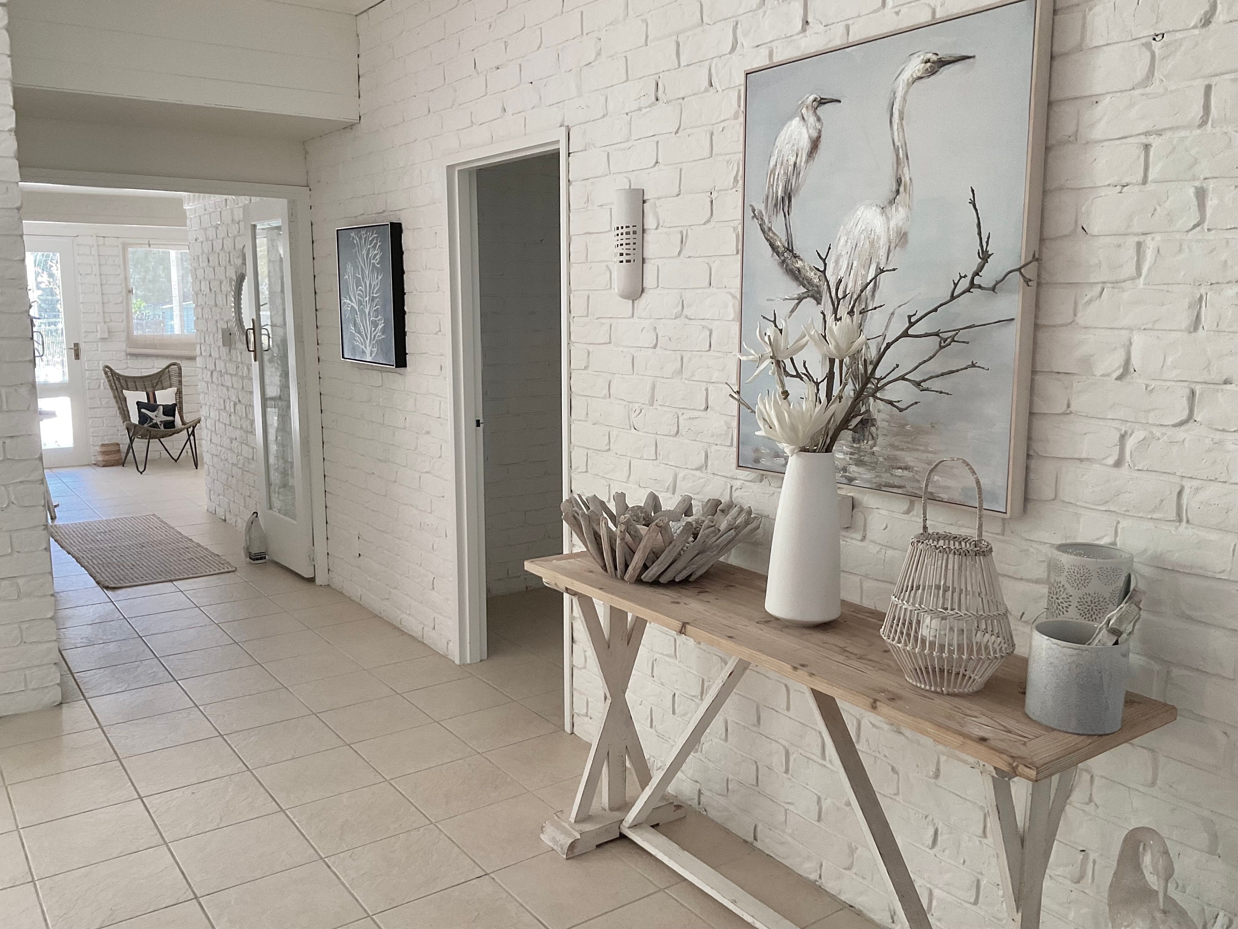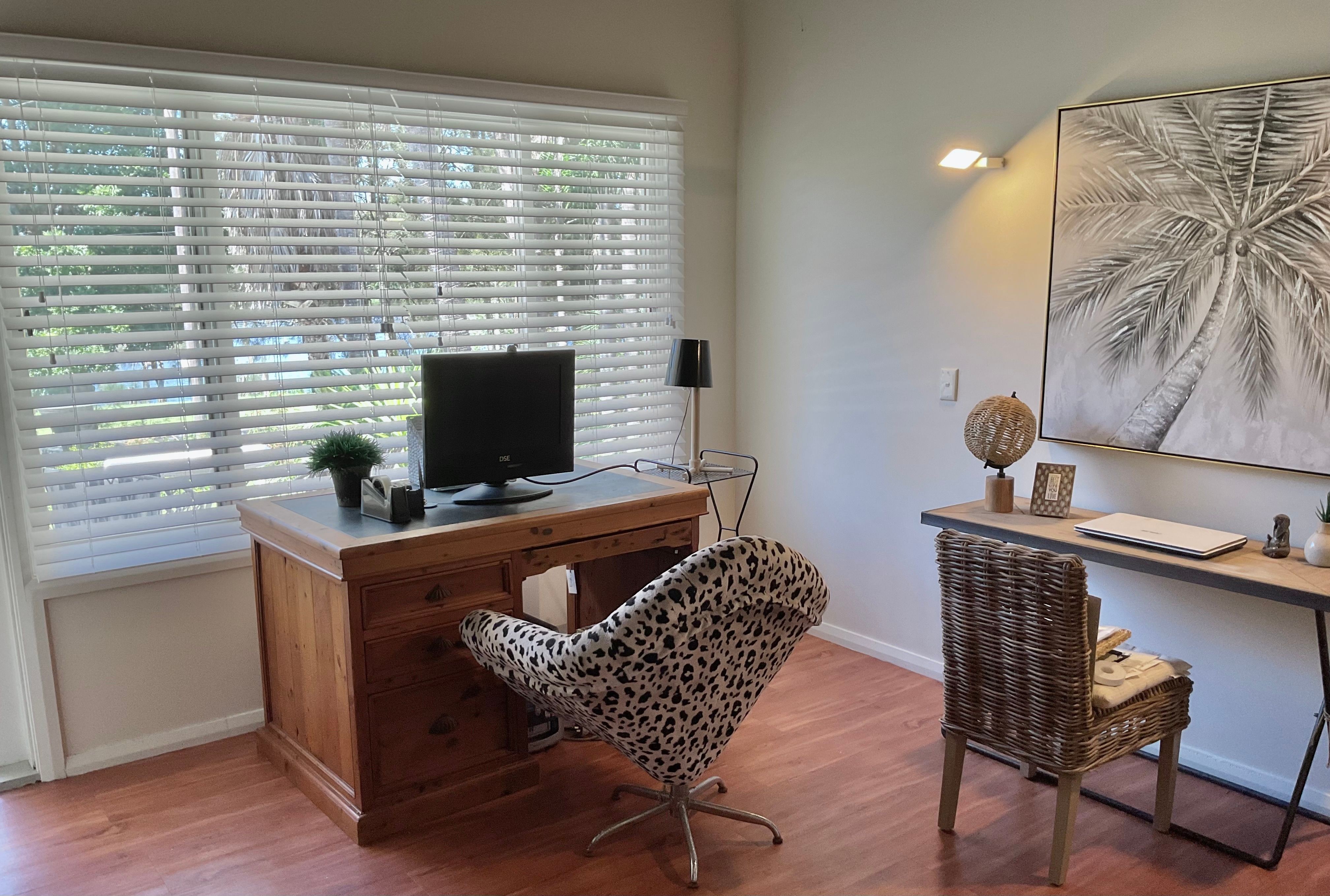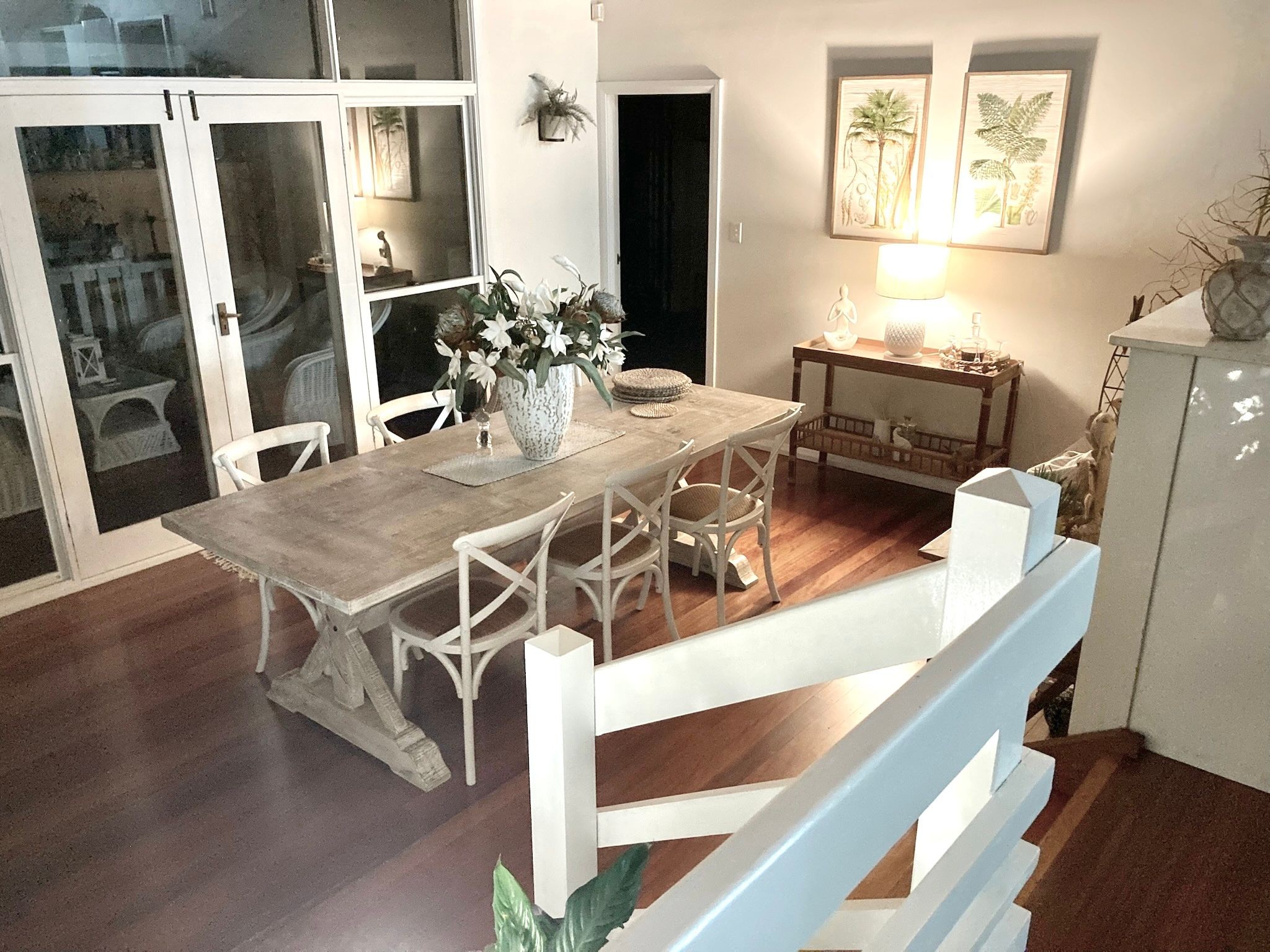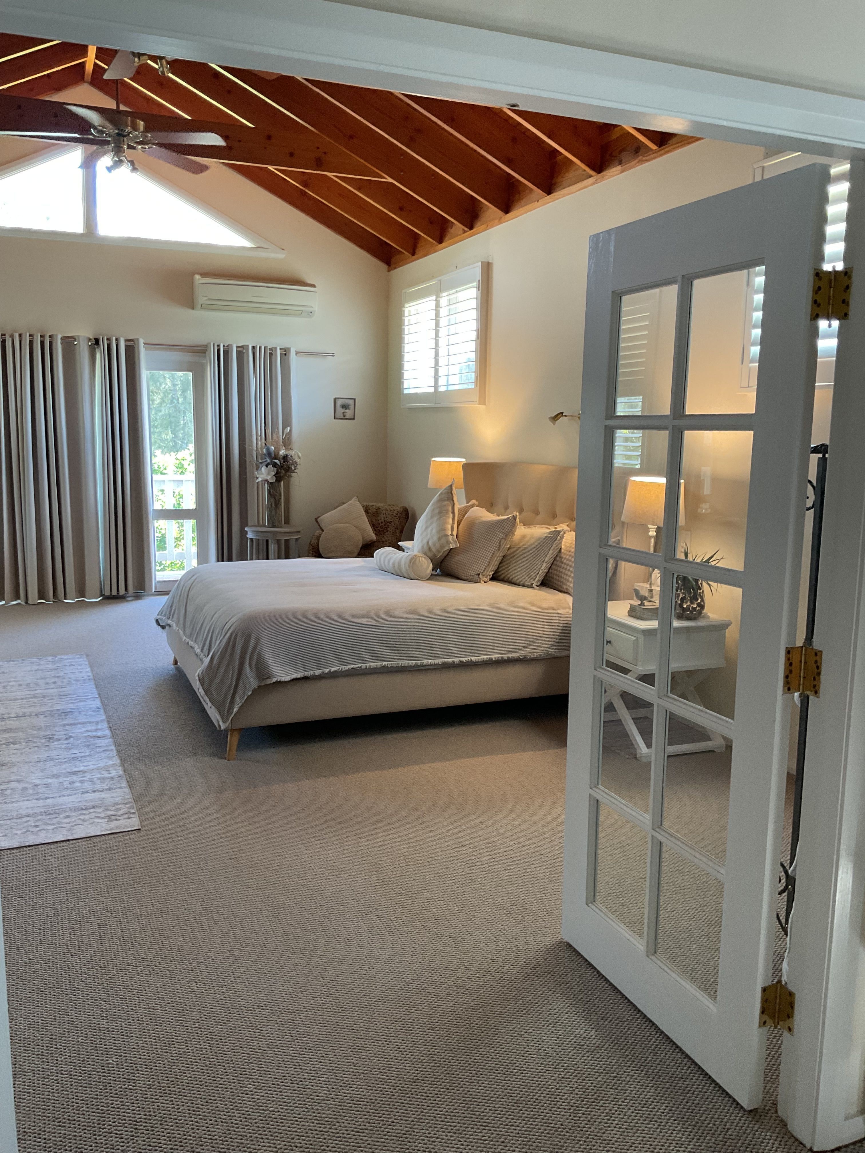 The large open plan kitchen under soaring ceilings includes a walk in pantry and is open to the lounge and dining areas …wonderful for entertaining . Surrounded by palm trees this area has a tropical and breezy holiday feel .