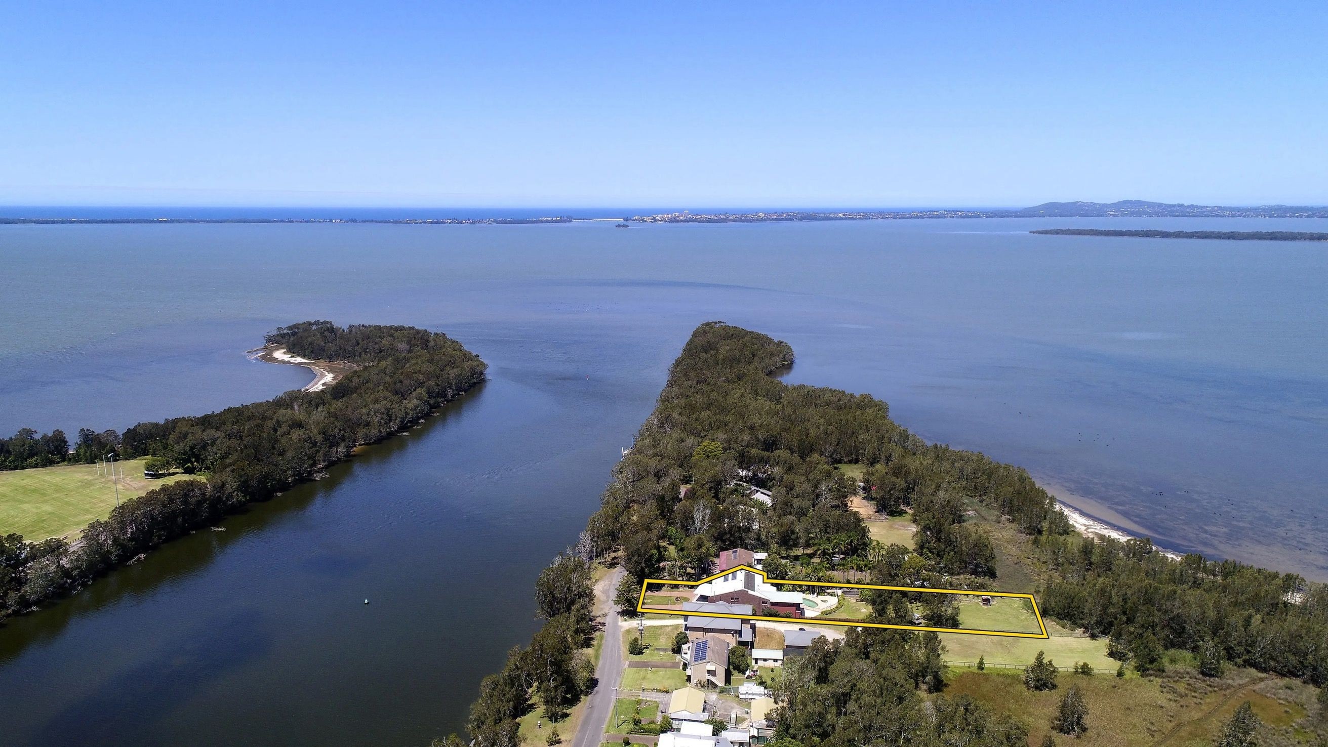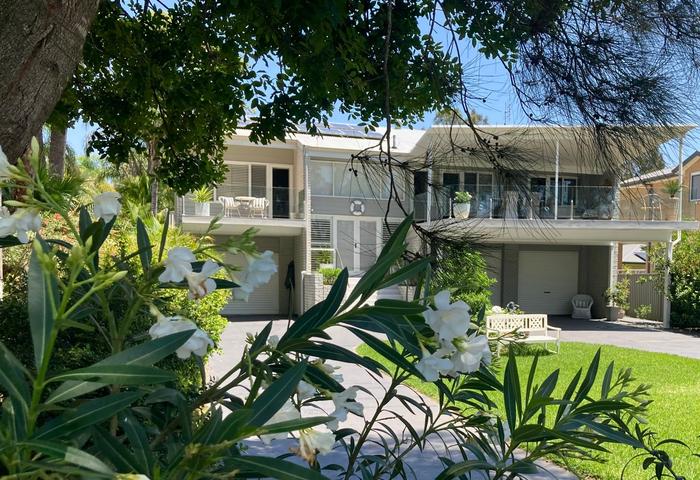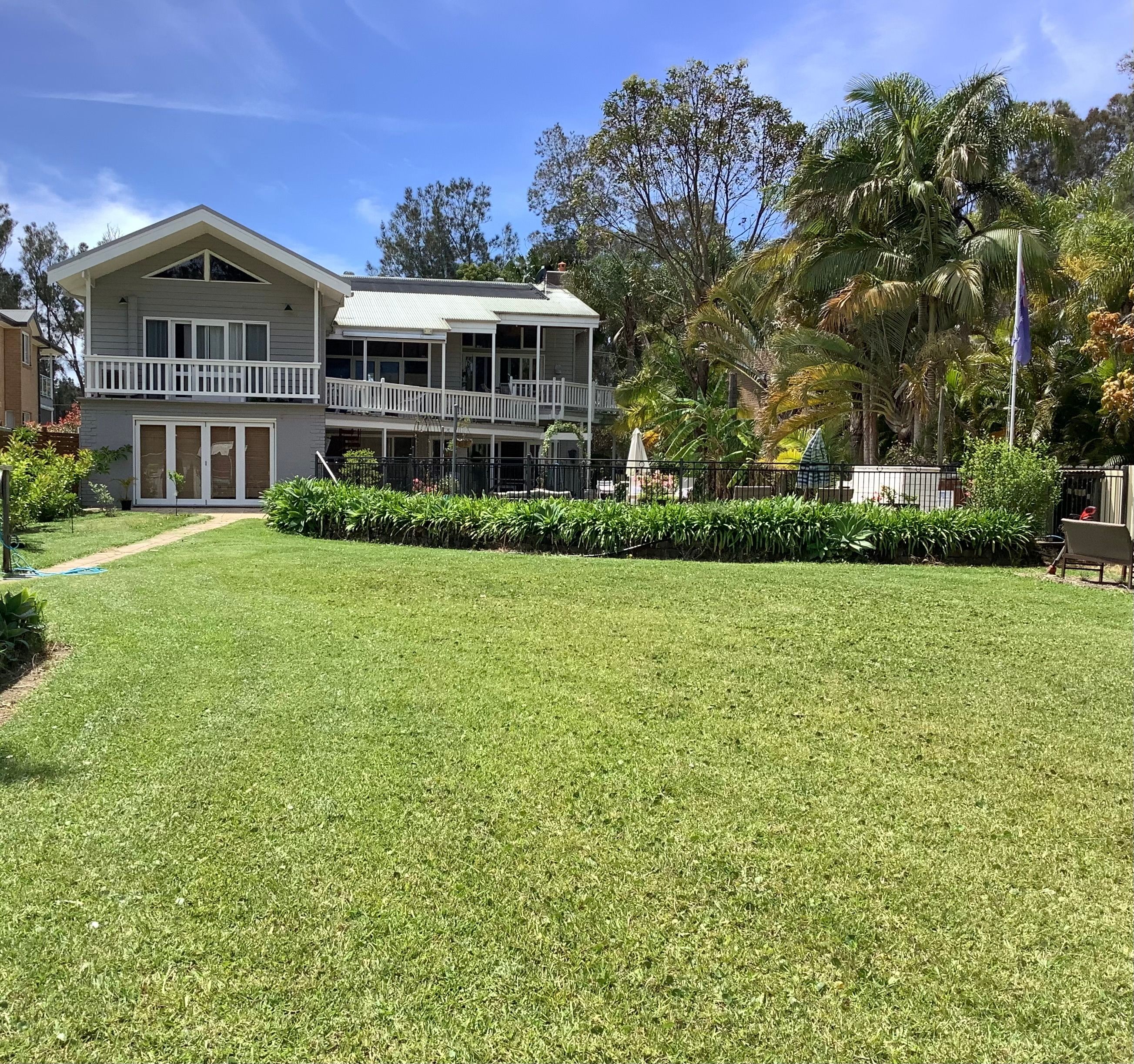 This larger than life coastal home in a stunning position on a peaceful and quiet peninsula is now available for sale . Located on over 1900 sqm of riverfront lifestyle with a northerly aspect surrounded by palm trees and sea breezes .