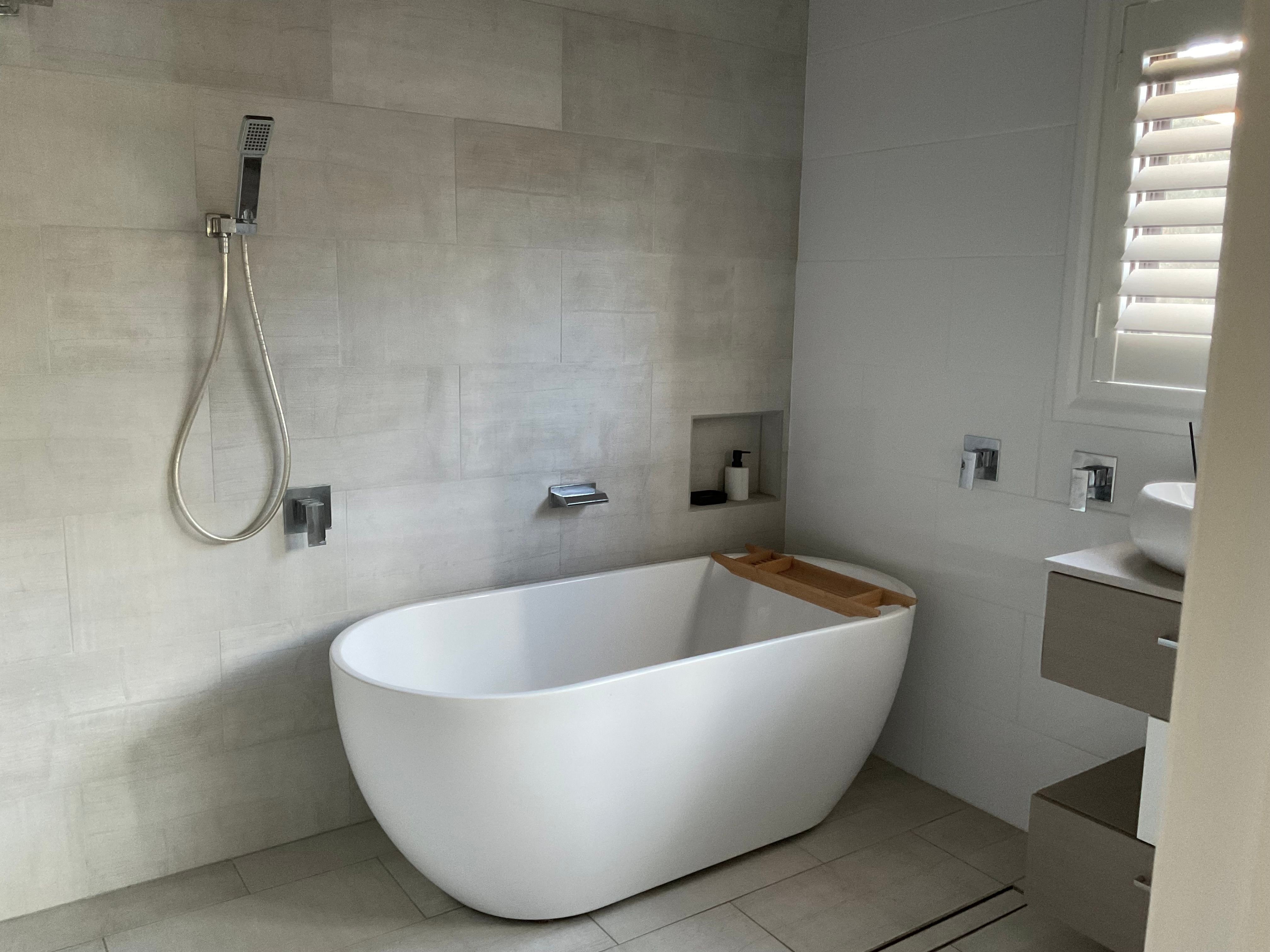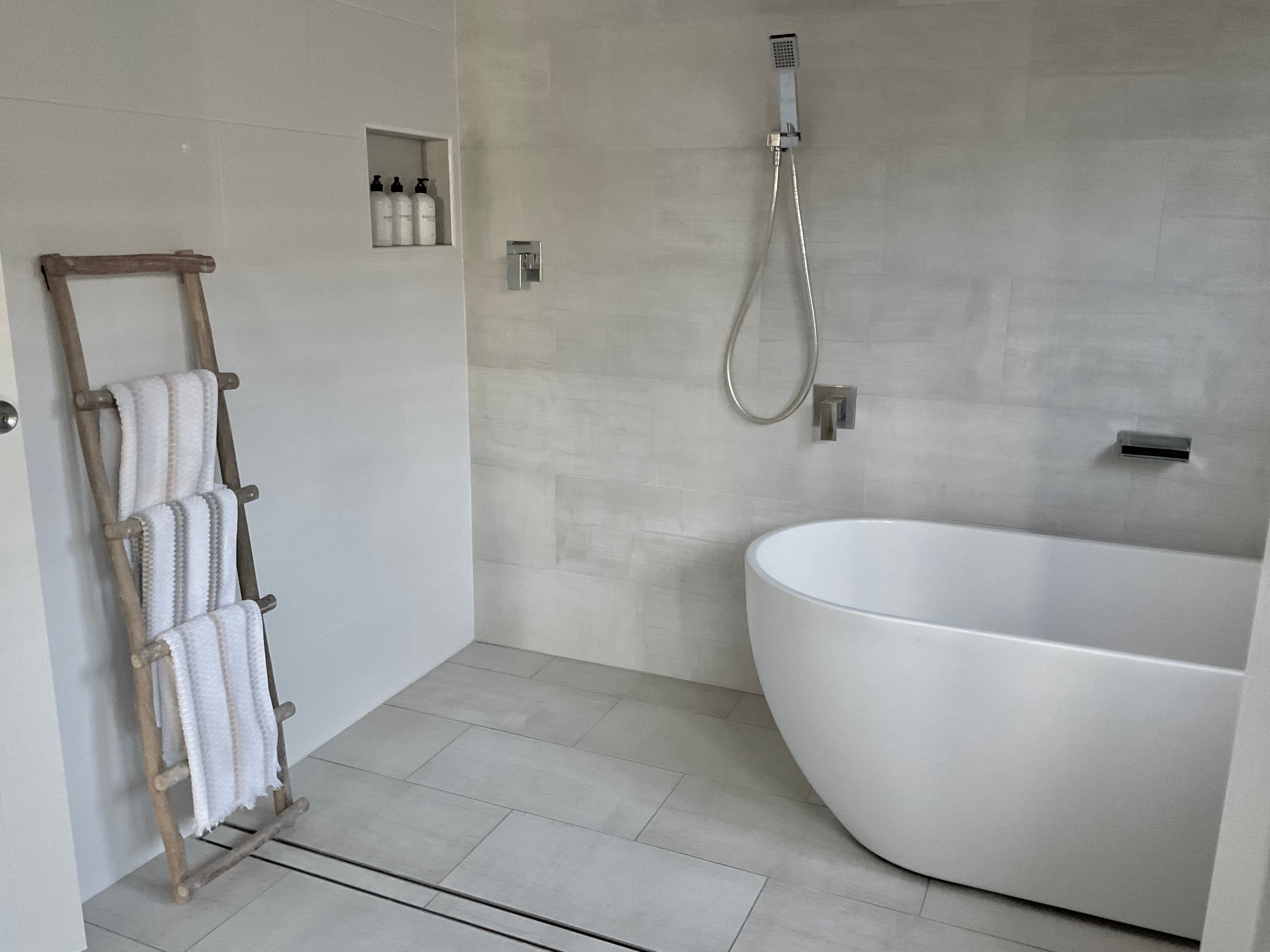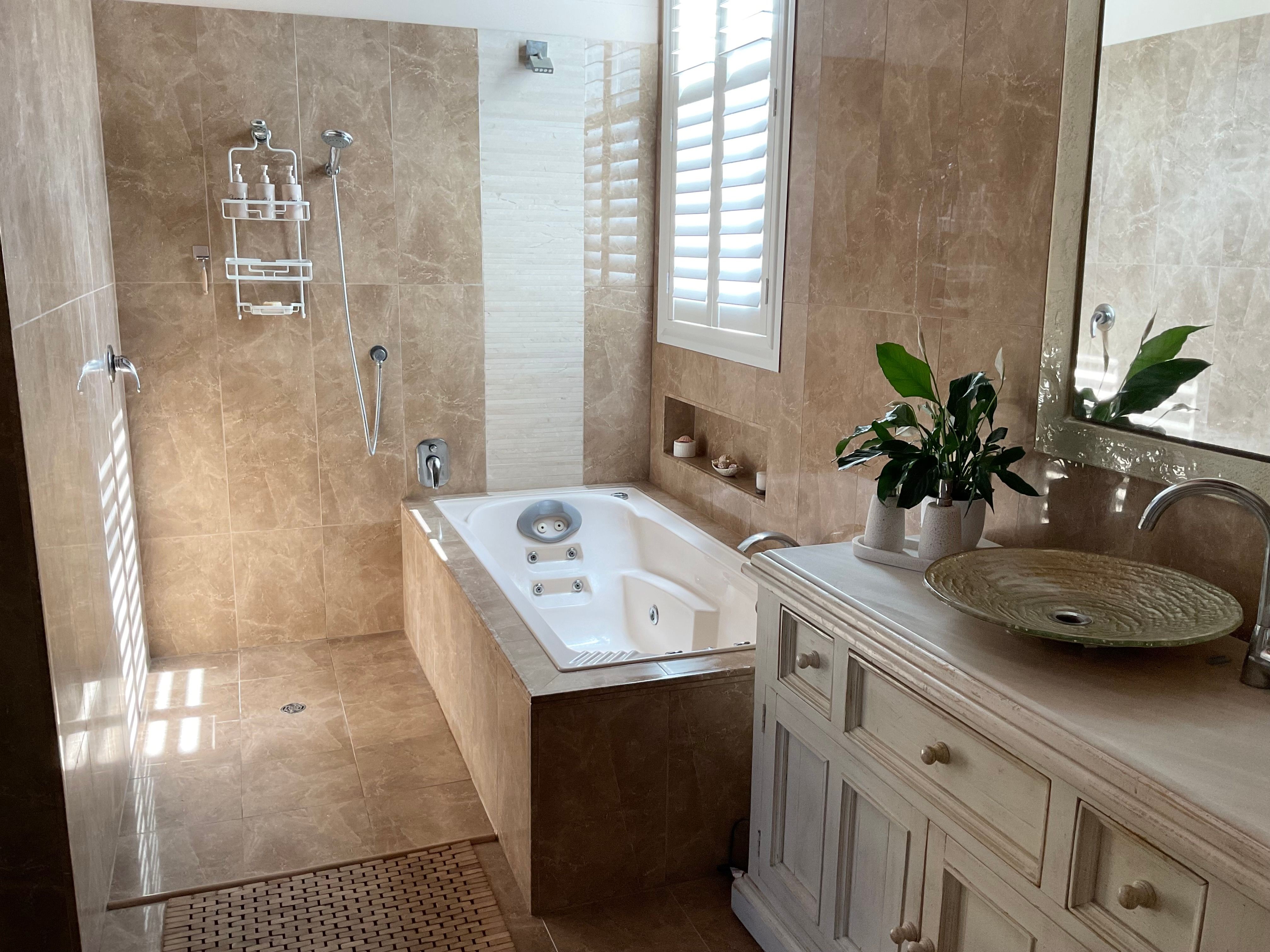Two beautiful bathrooms with open showers and spa bath complete this floor .