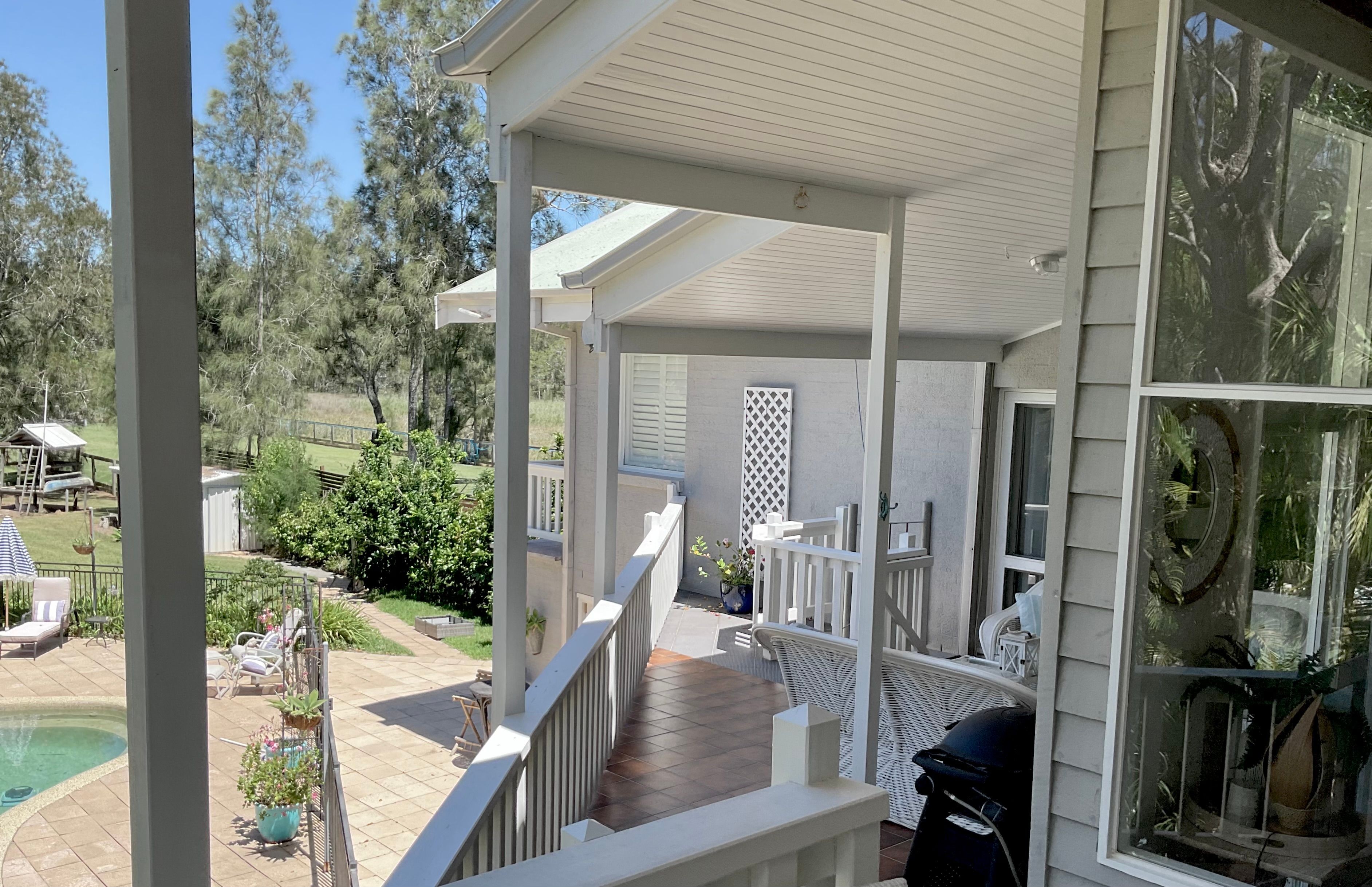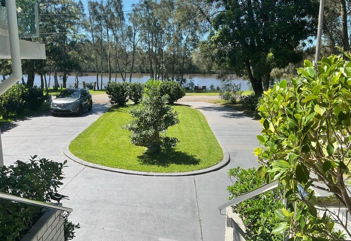 Featuring five bedrooms , four living areas , three bathrooms , three extensive outdoor decks , large laundry ,storage rooms and triple garaging / triple carport .The main bedroom suite has its own private wing and overlooks tropical gardens and the pool from its own outdoor balcony . An additional three bedrooms open to the front verandah and overlook the panoramic river.