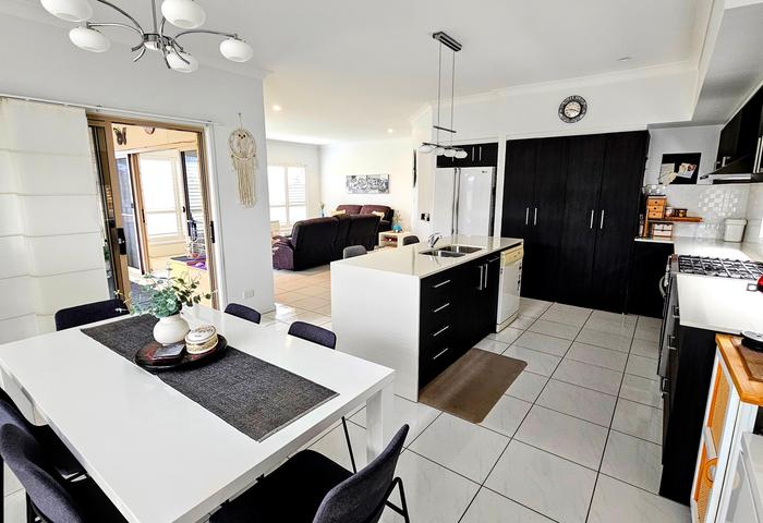 The modern kitchen, with its sleek dark cabinetry and contrasting white benchtops, is a practical and stylish hub. Tiled flooring throughout the main living zones ensures durability and effortless cleaning.