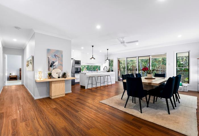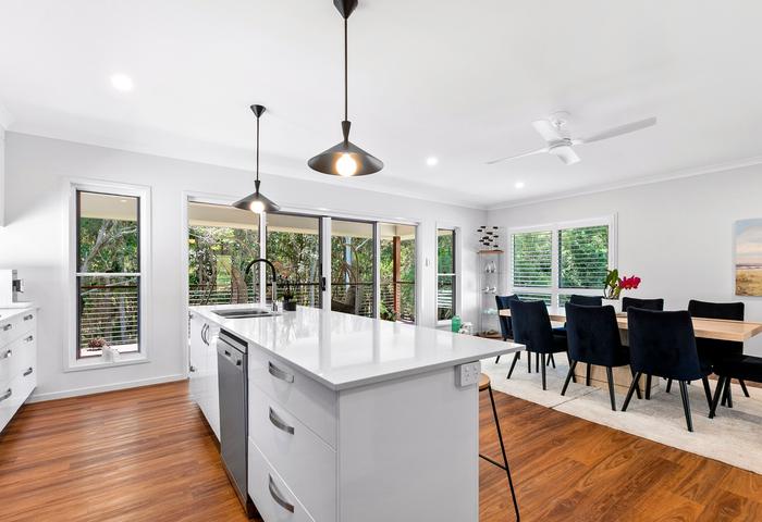 Featuring 4 generous bedrooms, 2 bathrooms, and 2 separate living areas, there’s plenty of room for families or those seeking extra space. The modern kitchen is the heart of the home, flowing seamlessly into the open-plan living and dining area. Step outside to the rear deck and take in the calming wetland views—perfect for entertaining or simply unwinding in the coastal breeze.
