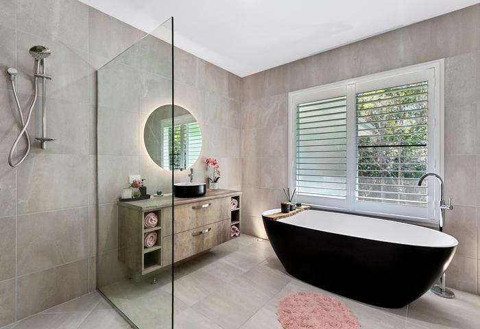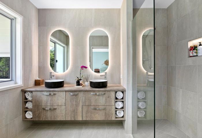 Modern bathrooms with backlit mirrors and modern bath