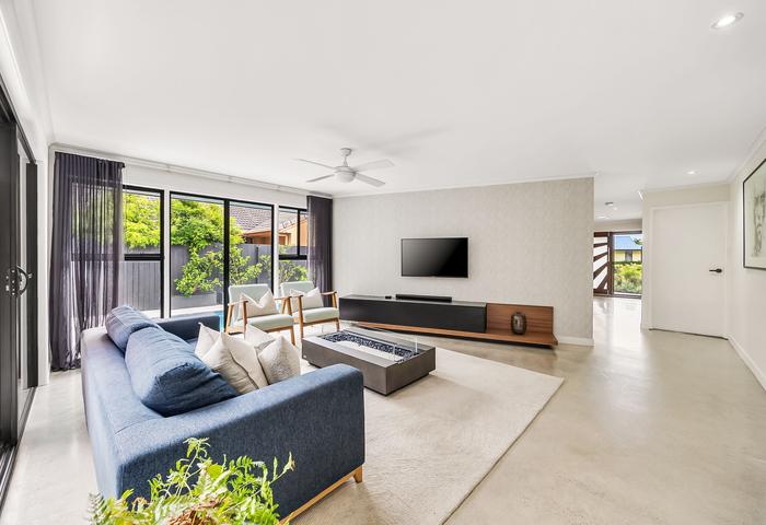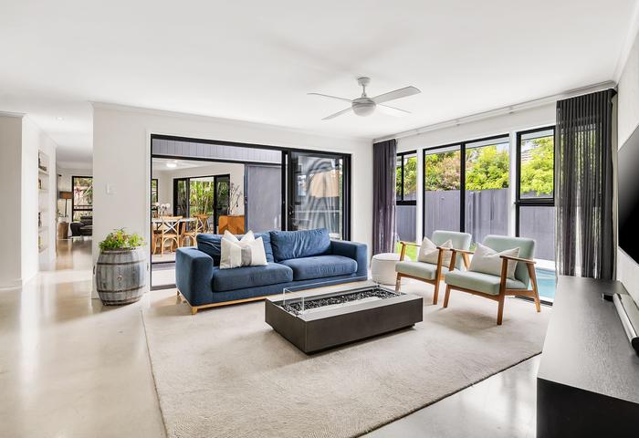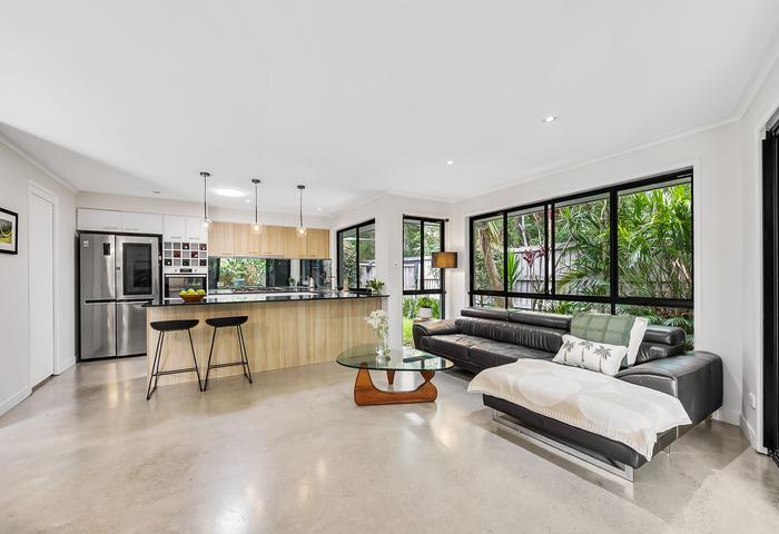 The home features polished concrete floors and a spacious open-plan layout, creating a light-filled, contemporary atmosphere that's both stylish and unique.