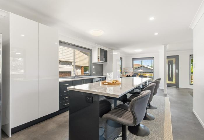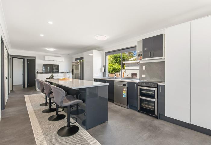 The home features three comfortable bedrooms all with a bed ,built-in robes,fans and ac , providing comfort all year round. A large open plan galley kitchen with ample storage, a huge seated island bench with bar stools, plumbed fridge, dishwasher, dining area and breakfast bar and air-conditioning through the entire living and lounge area is perfect for relaxing on the couches in comfort. The home also has a designated office space with corner desk.