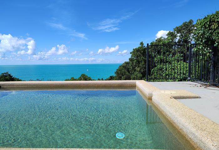 The living room opens up in an outdoor, shaded entertainment area to enjoy the ocean views and peaceful evenings. Take a dip in the inground pool, or unwind on the pool deck or balcony with gorgeous views of the ocean and surrounding islands.