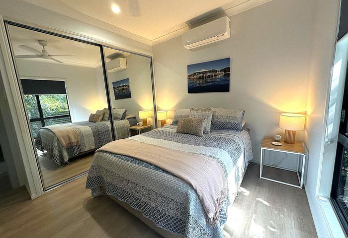 * The spacious master bedroom with wall-mounted bedsides and beautiful wall lamps, has a walk-in wardrobe plus sliding doors that open out onto the front deck.