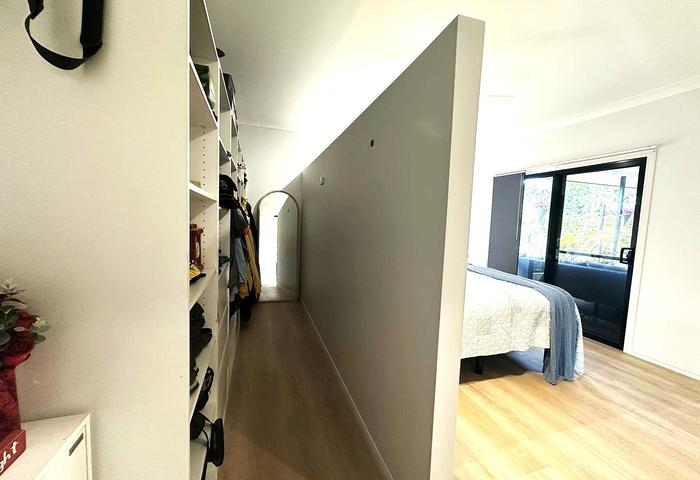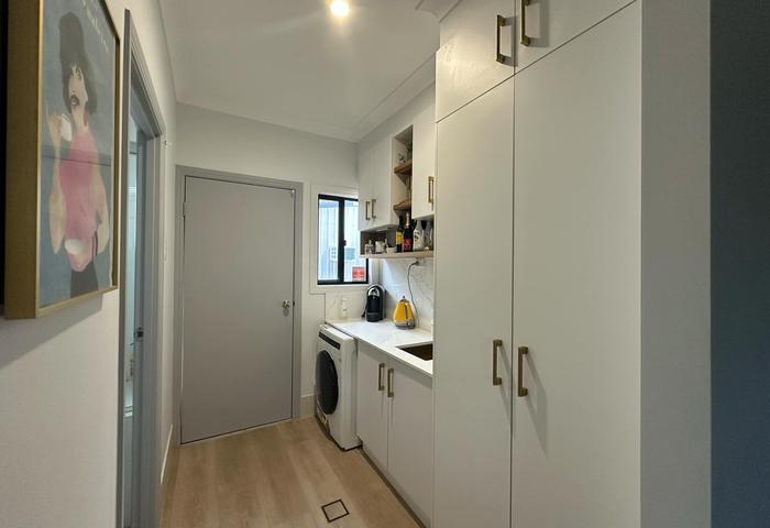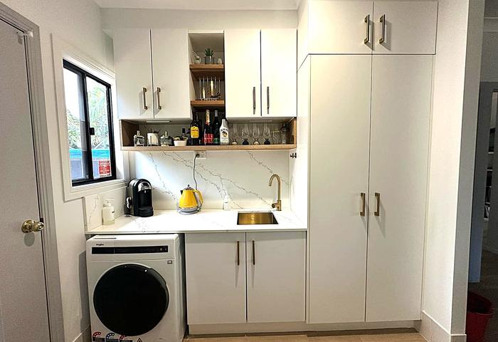 *The internal laundry, with direct access to the backyard, has been cleverly re-designed for dual use as a butler’s pantry and beautifully appointed to match the kitchen with stone benchtop and splash back, cupboards to the ceiling, open timber shelves and brushed brass fittings.