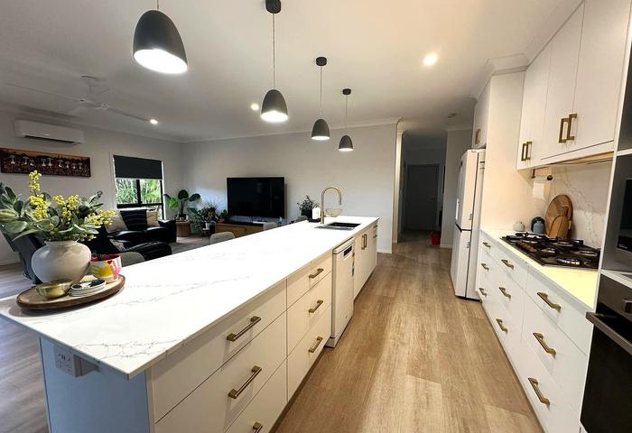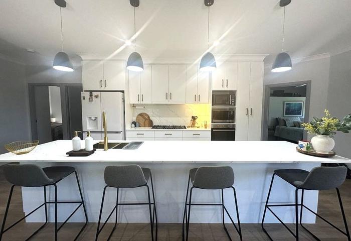 * Stunning new kitchen with cupboards all the way to the ceiling for extra storage. Electric wall oven, space for two microwave ovens and a quality Bosch 6 burner gas cooktop, stone top and splash back and deep soft close drawers for storage. The huge island bench has deep, soft close drawers, dual rubbish/recycling pull out bins, beautiful stone top and, brushed brass fittings which really make a statement.