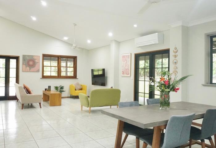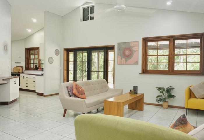 From the moment you arrive via the long, palm-lined driveway, you’ll appreciate the privacy, space, and attention to detail throughout. Inside, high ceilings and an open-plan layout create a light and airy feel, while the new aluminium UV glass windows and reverse cycle conditioning provide year-round comfort.