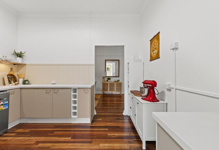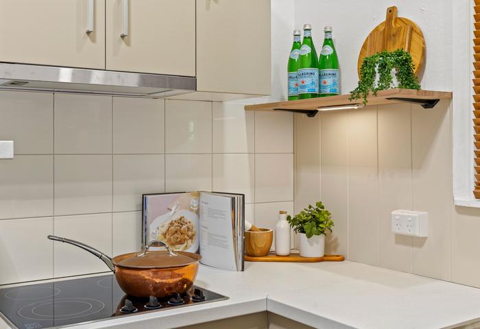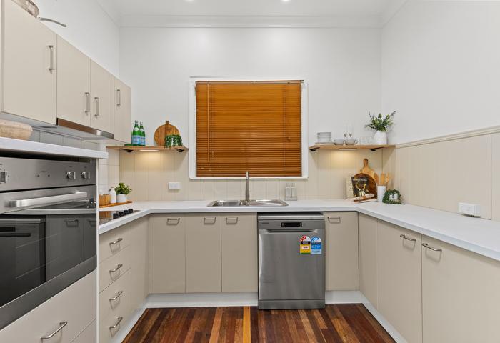 The recently renovated bathroom is a standout, finished with a clean, modern aesthetic and quality fittings. The updated kitchen is equally functional and well-considered, complete with a dishwasher and ample storage, designed for easy everyday living.