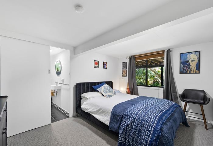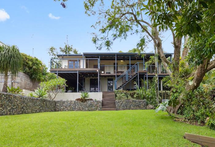 The home captures beautiful light and leafy outlooks over the surrounding hinterland. The tiered and landscaped gardens are a green thumbs delight, supported by gabion retaining walls, a water tank drip-feed line and solar panels for energy efficiency.