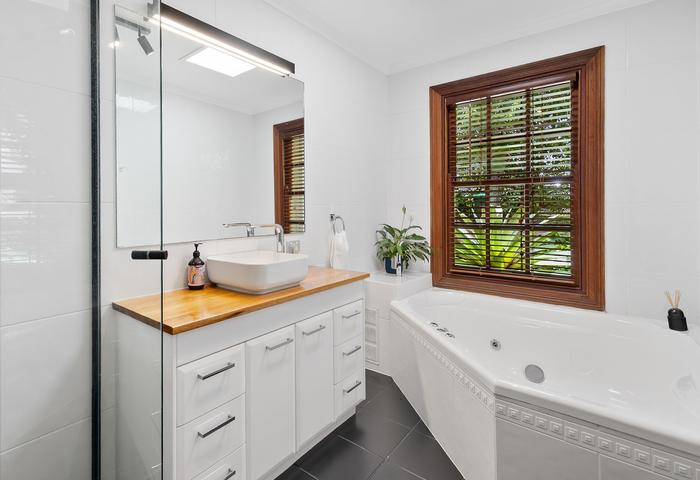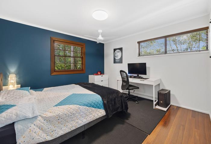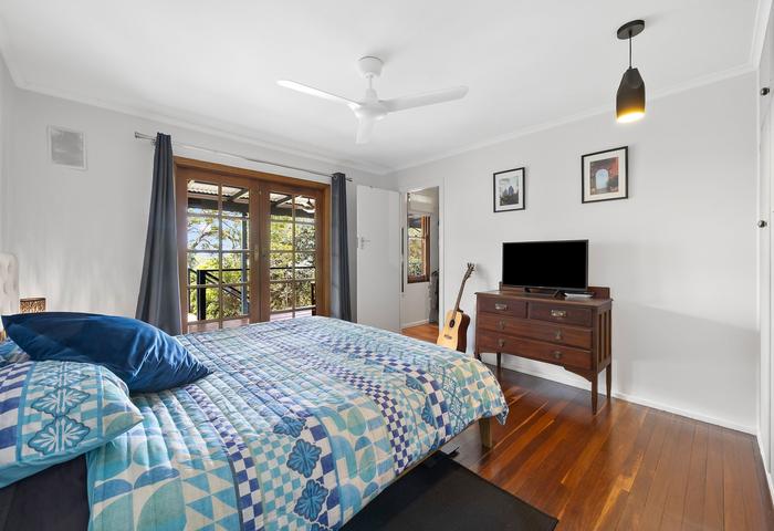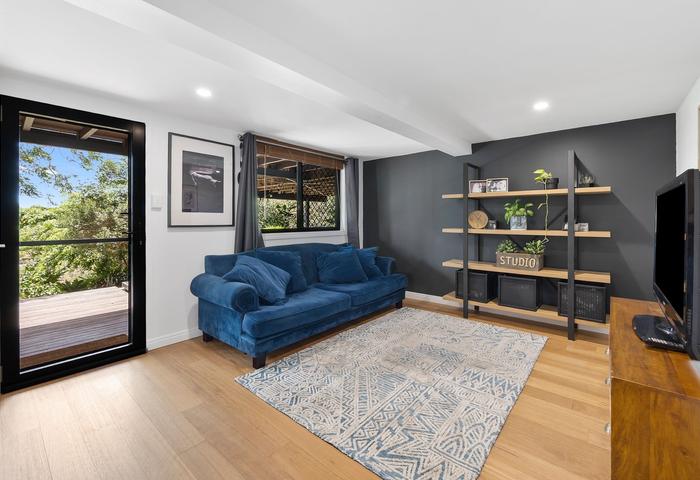Entertaining is a highlight here. Five sets of double timber doors open directly onto a large elevated deck, creating a seamless flow between the indoor living areas and the outdoors. Downstairs, the second living zone and covered patio offer additional space for relaxing, hosting guests or creating a private retreat.