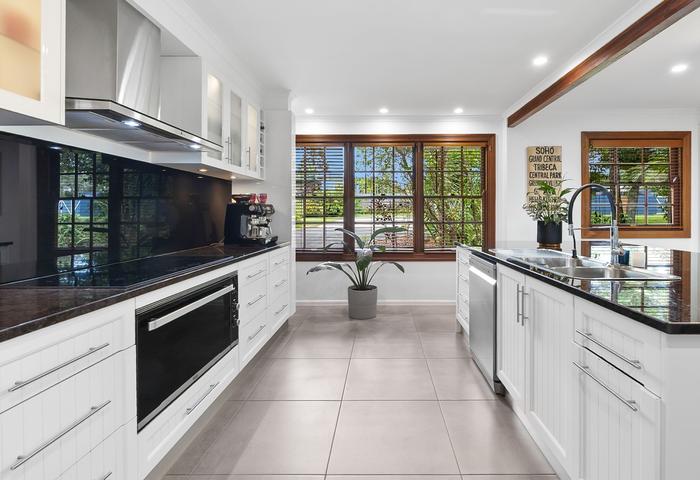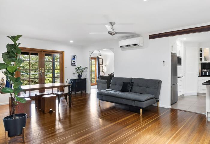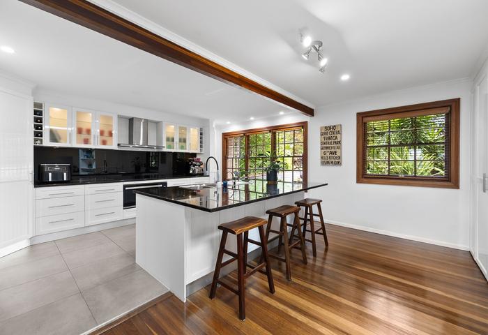 The home has been beautifully renovated over time. It features character timber window framing and solid timber floors upstairs. The recently renovated downstairs area boasts engineered Australian Blackbutt flooring and new black-framed aluminium windows with security screens. The kitchen includes large stone-top benches and recent, quality appliances.