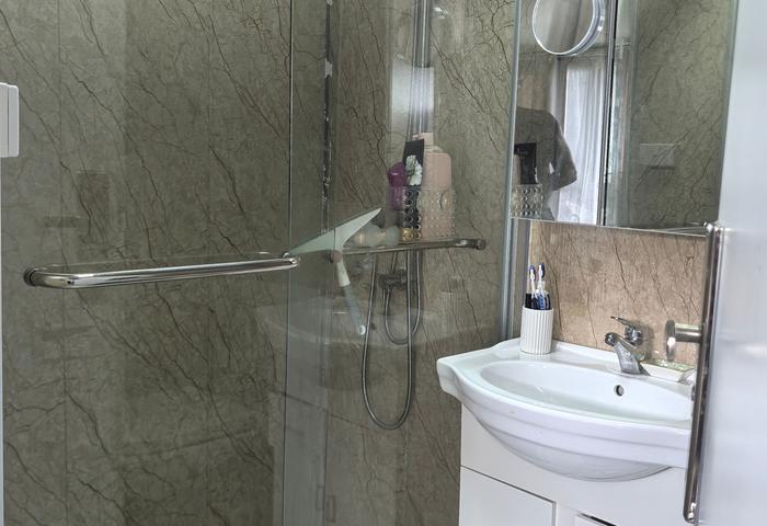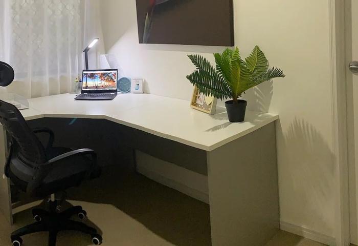 An air-conditioned lounge with a modern corner recliner sofa, height-adjustable coffee table, smart 40" UHD TV, a study nook with corner desk, linen closet, plus a large bathroom with shower and bathtub, and a separate toilet for convenience.