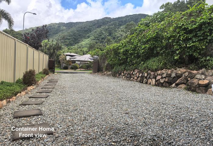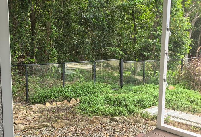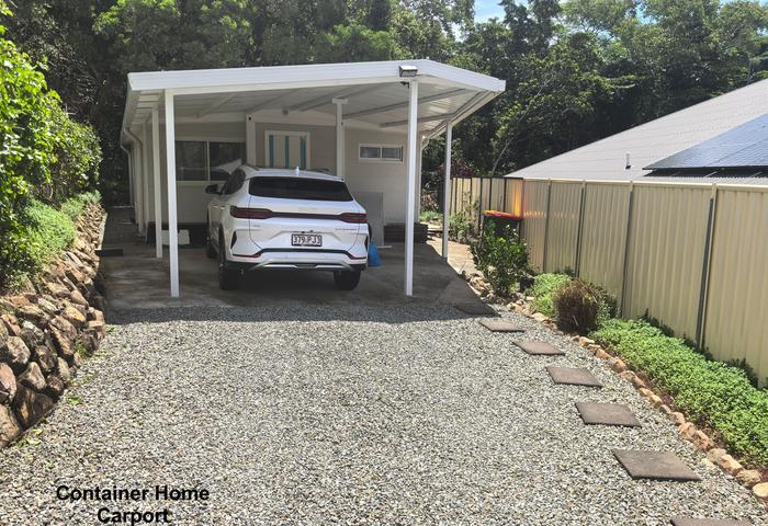 A stylish stone driveway with rock walls and garden beds leads to a single carport with extra covered space for bikes or storage. At the rear, sliding doors open to a private verandah, tiered gardens and a side lawn area. A stone pathway wraps around the home, and the glass rear fence once again frames those rainforest views — creating a wonderful sense of being immersed in nature.