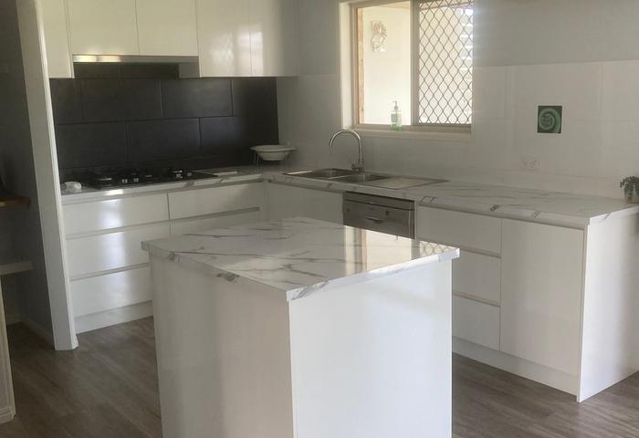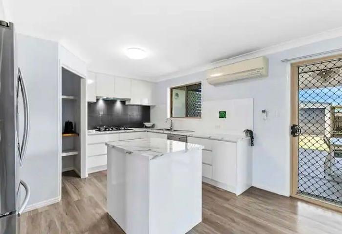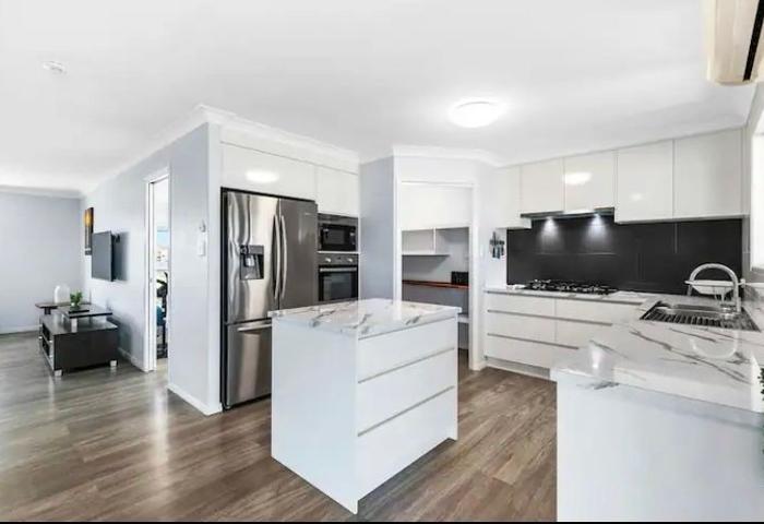 The modern kitchen is fitted with a dishwasher, making meal prep and cleanup effortless. It has a large walk-in pantry and an island bench.