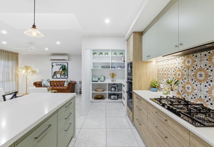 Soaring ceilings, curated finishes and light-filled interiors create an immediate sense of calm throughout. At the heart of the home, the designer kitchen showcases a striking stone waterfall island, premium Artusi appliances, multiple Velux automatic skylights and a generous walk-in pantry. This impressive space flows seamlessly to the expansive outdoor entertaining area complete with full outdoor kitchen, built-in BBQ and bar fridge overlooking the sparkling 7.5m x 3.8m saltwater pool and manicured Sir Grange lawns.