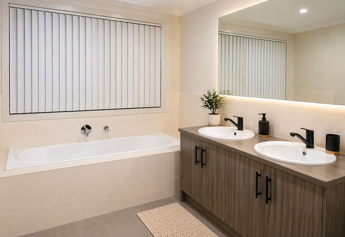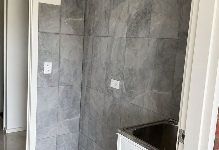 The main bathroom is well appointed with a bath, double vanity, and separate toilet for added convenience. The laundry is partially tiled, positioned for practicality, and includes direct rear access.