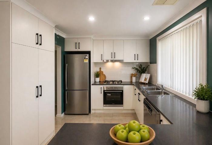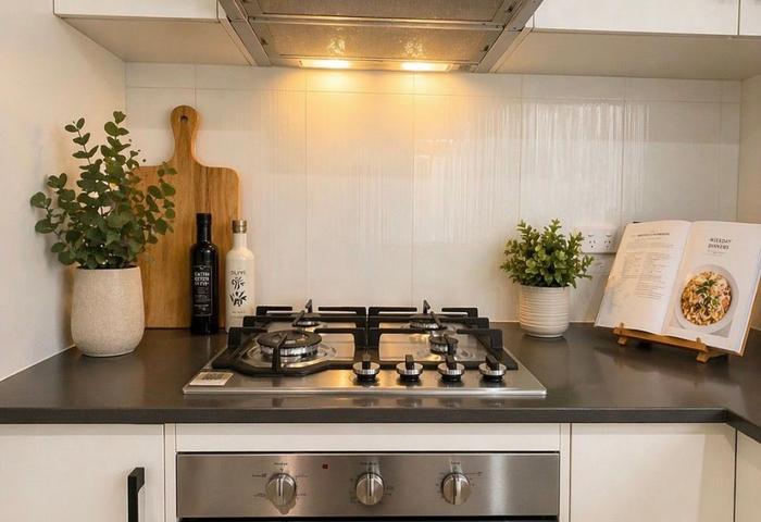 At the heart of the home is a spacious open-plan kitchen, dining, and living area designed for everyday family life and entertaining. The kitchen offers ample cupboard space, gas cooktop, electric oven, dishwasher, and quality finishes throughout. All kitchen appliances are brand new and have never been used.
