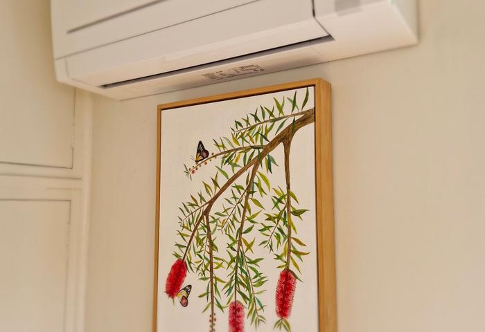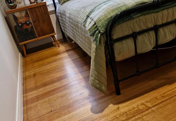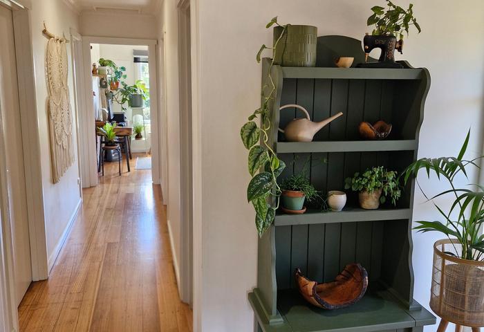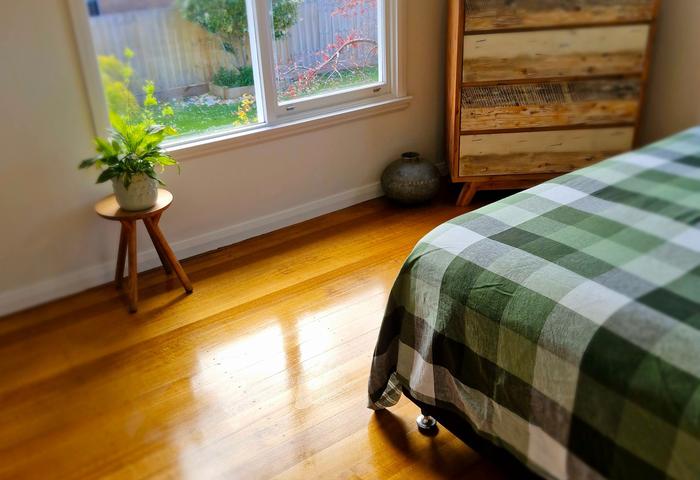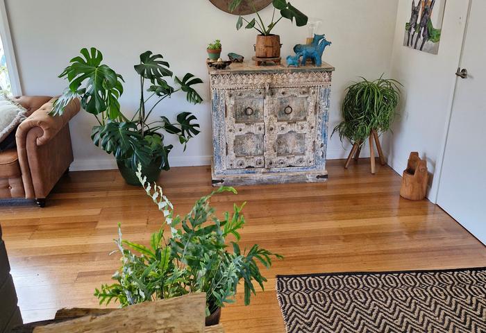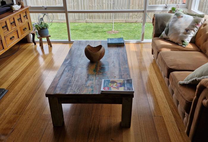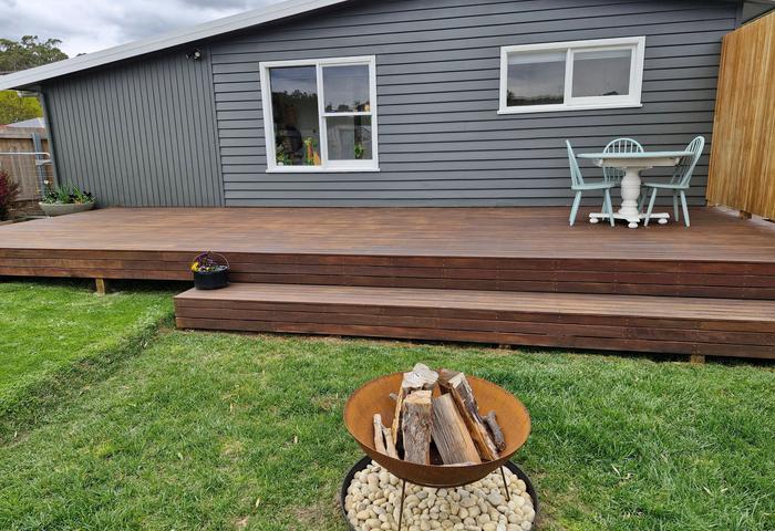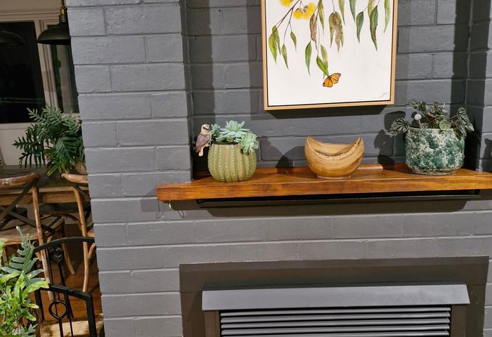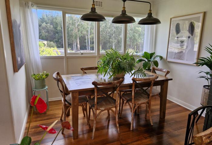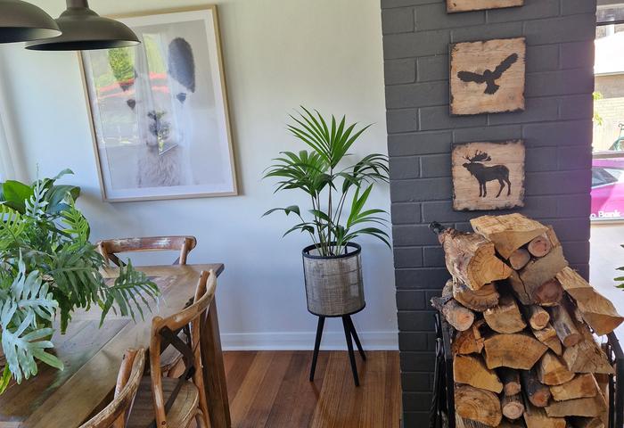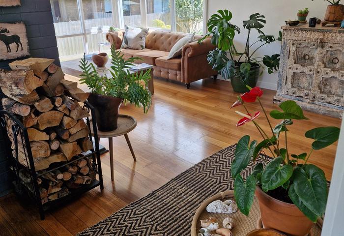 Inviting light filled living area with cozy open fireplace and gorgeous Tassie Oak floorboards throughout, adding warmth and character.