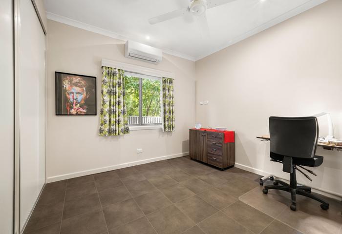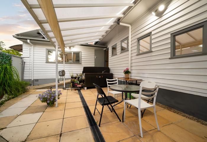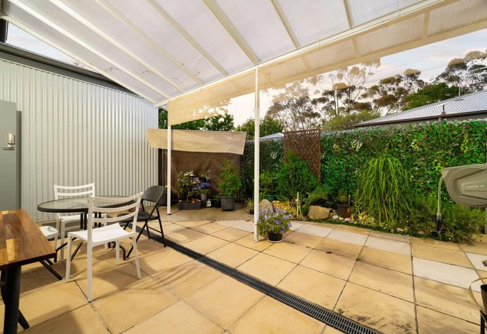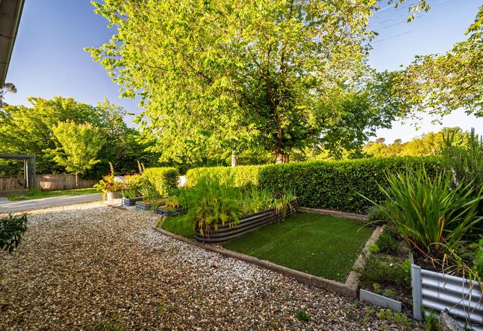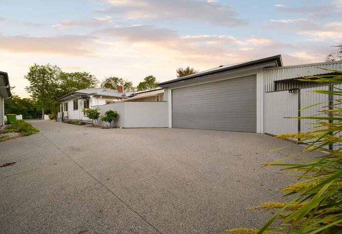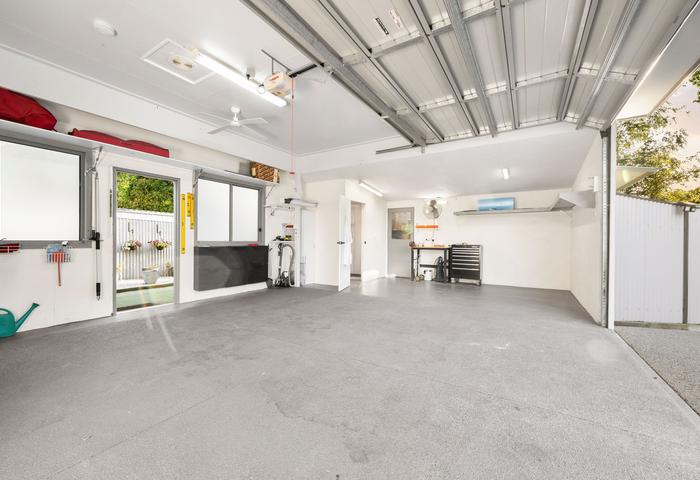 Outdoors, sustainable living continues with a paved and covered entertaining area, raised garden beds, pebbled garden and a fernery. The exposed aggregate driveway leads to a double garage, which has been enlarged and enclosed to provide a workshop, the third bathroom and secure storage.
