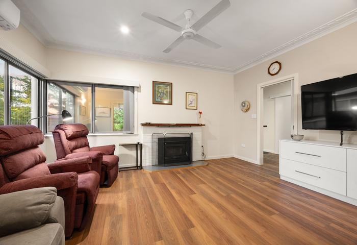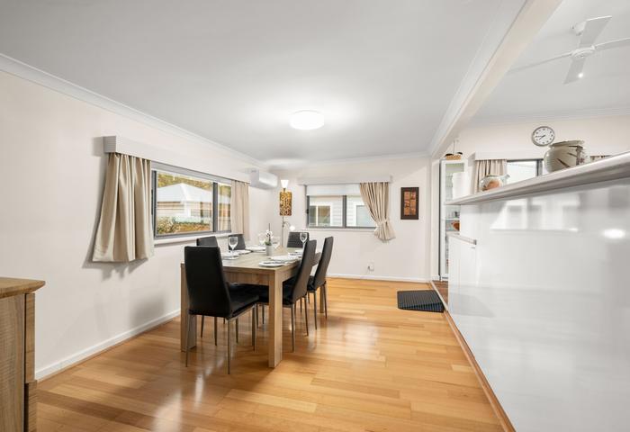 Inside, the home feels warm and welcoming, with solid timber and timber laminate flooring flowing through the kitchen, dining, lounge, and hallway.