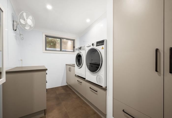 *Laundry with elevated washer and dryer stands, plus a heated/airing linen cupboard.