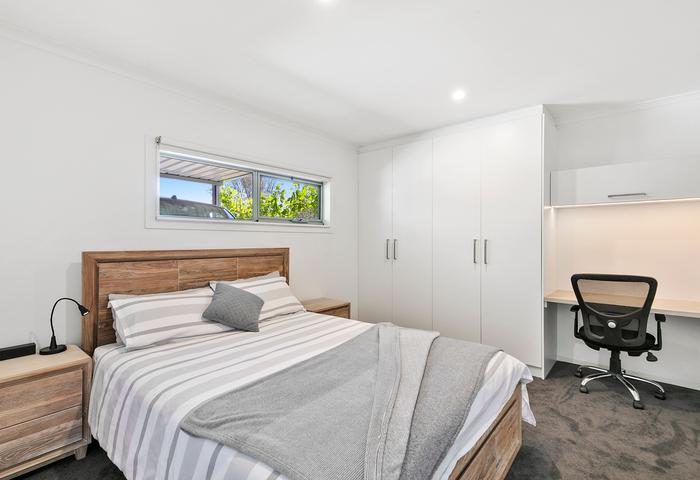 The modern kitchen is the heart of the home, with quality appliances, a dishwasher, and ample storage. Floorboards flow throughout, creating warmth and connection between the open-plan living zones and outdoor spaces.
