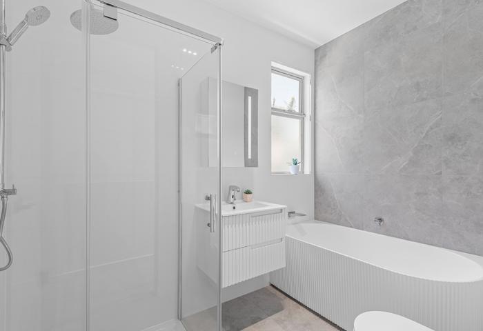 Upstairs are three bedrooms, one with soaring ceiling all with built in mirror wardrobes. Master bedroom includes ensuite while the remaining two bedrooms share bright family bathroom with freestanding modern bath and separate shower.