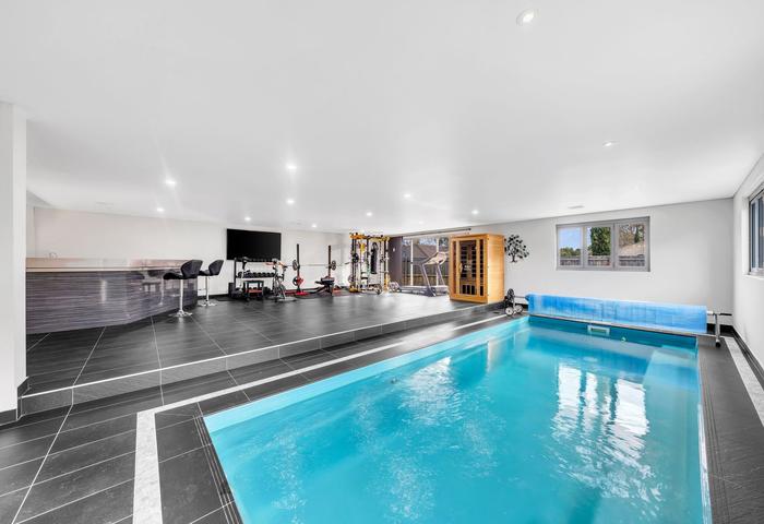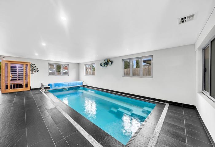 Indoor swimming pool heated with solar and gas provides a refreshing centerpiece for summer gatherings, complemented by a low-maintenance backyard and plenty of space for grilling and relaxing. double garages offer ample off-street parking and storage.