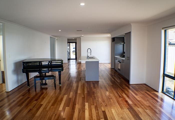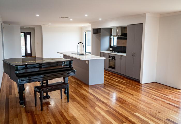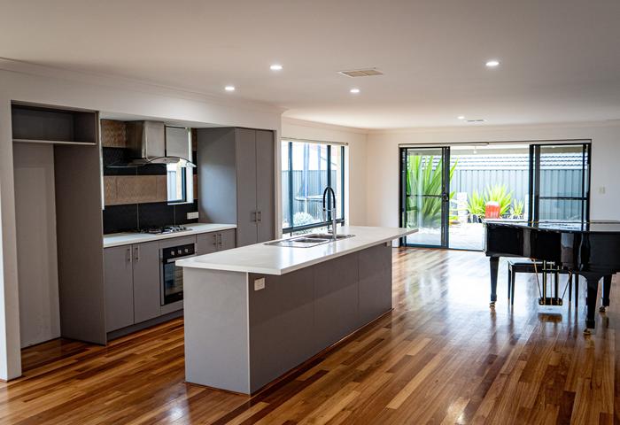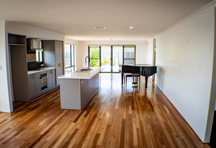 At the heart of the home is the expansive open-plan kitchen, dining and living area, finished with stunning timber floors that bring warmth and character to the space. The kitchen is both functional and inviting, featuring ample storage, generous bench space and a central island overlooking the main living zone, making it ideal for everyday living and entertaining.