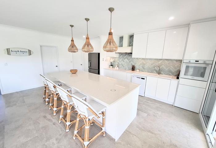 The KITCHEN has a massive stone island perfect for lazy breakfasts and entertaining. The kitchen has been carefully planned for ease of use and entertaining; with a large walk-in pantry, appliance cupboard, pointpod pop up powerpoint, filtered water, plumbed in fridge, push open/soft close cupboards and induction stove top.