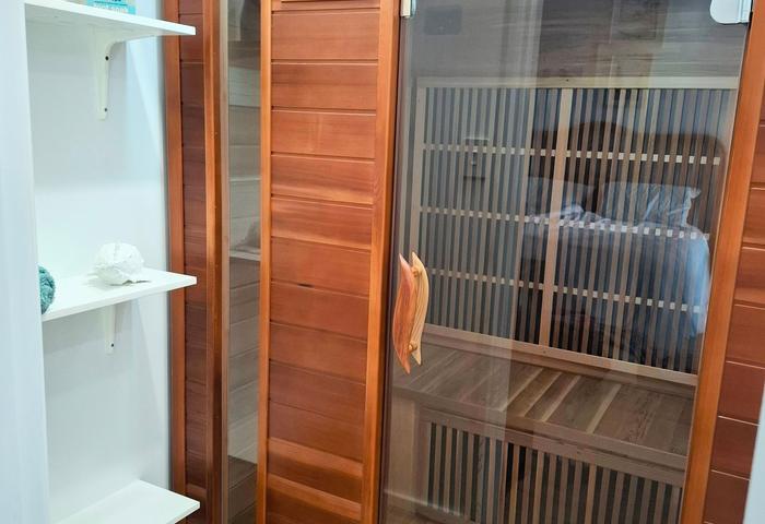 Come back from the beach sandy? Never fear, there is a beautiful hot/cold OUTDOOR SHOWER AND TOILET perfect for those sandy beach days. There is also KEYLESS ENTRY at the front, so no pockets are needed for outings, perfect for when you just want to grab a towel and go.